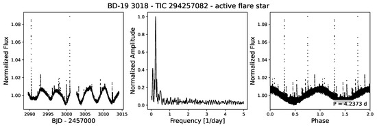 Representative TESS photometric data of the flare star, TIC 294257082 (BD-19 3018) [36]. The structure and data source of the figure is the same as of Figure 2. Note that rotational modulation due to starspots is also observable. We used the spot modulation period for the phased light curve in the right panel.