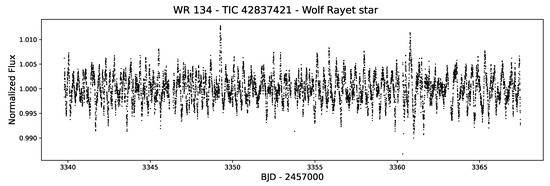 Wolf-Rayet (WR) stars are massive, evolved stars that are in a late stage of their stellar evolution. They are characterised by their strong, broad emission lines, extreme mass loss, and high surface temperatures. Luminous blue variables (LBVs) are massive, evolved stars that undergo extreme variability in brightness and mass loss. Their brightness fluctuates over months to decades, with variations of up to 2 magnitudes in optical wavelengths. They show unpredictable outbursts, where they loss large amounts of mass. We can observe high-frequency variability of WR and LBV stars [40]. However, their light curves display low-frequency stochastic variability (’red noise’), too. Ref. [40], using TESS observations, did not find coherent, isolated signals for LBVs but detected such signals in five WR stars. A representative TESS light curve of a WR star, TIC 42837421 (WR 134) is shown in Figure 7.