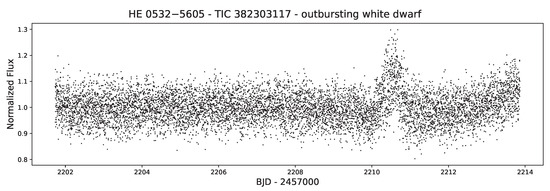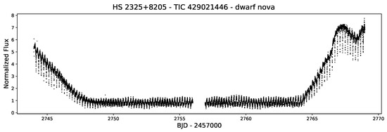 Dwarf novae show large (2–6 magnitudes) brightening from time to time. The physical cause of this is that the flow of inward material increases significantly, which increases the luminosity of the disc by heating. TESS also observed dwarf novae, for example the star AY Psc, which is an eclipsing system. The TESS observations contributed to an improvement of its orbital period. Unfortunately, ref. [41] did not observe the brightening phase of this system during the TESS observations. The situation is different for the dwarf nova HS 2325+8205, where the authors presented that the system has four different types of outbursts [42]. The authors derived an outburst period of about 13.83 d, and, for the first time, they presented that there are quasiperiodic oscillations with a period of ∼2160 s in the long outburst of HS 2325+8205. An example TESS light curve of this dwarf nova is shown in Figure 8.