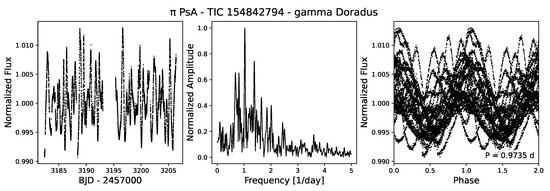 - Antoci, V.; Cunha, M.S.; Bowman, D.M.; Murphy, S.J.; Kurtz, D.W.; Bedding, T.R.; Borre, C.C.; Christophe, S.; Daszyńska-Daszkiewicz, J.; Fox-Machado, L.; et al. The first view of δ Scuti and γ Doradus stars with the TESS mission. Mon. Not. R. Astron. Soc. 2019, 490, 4040–4059. [Google Scholar] [CrossRef]
