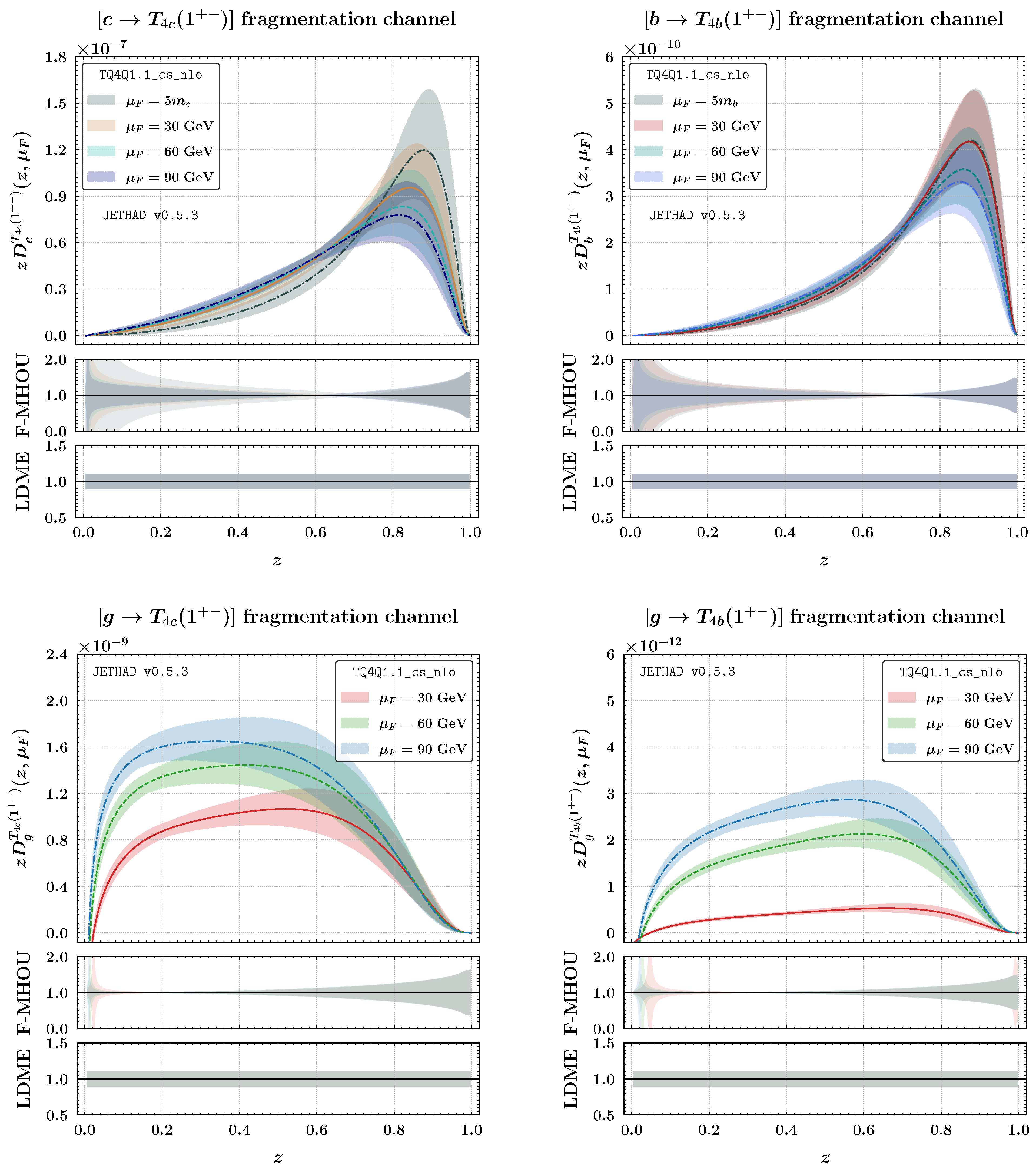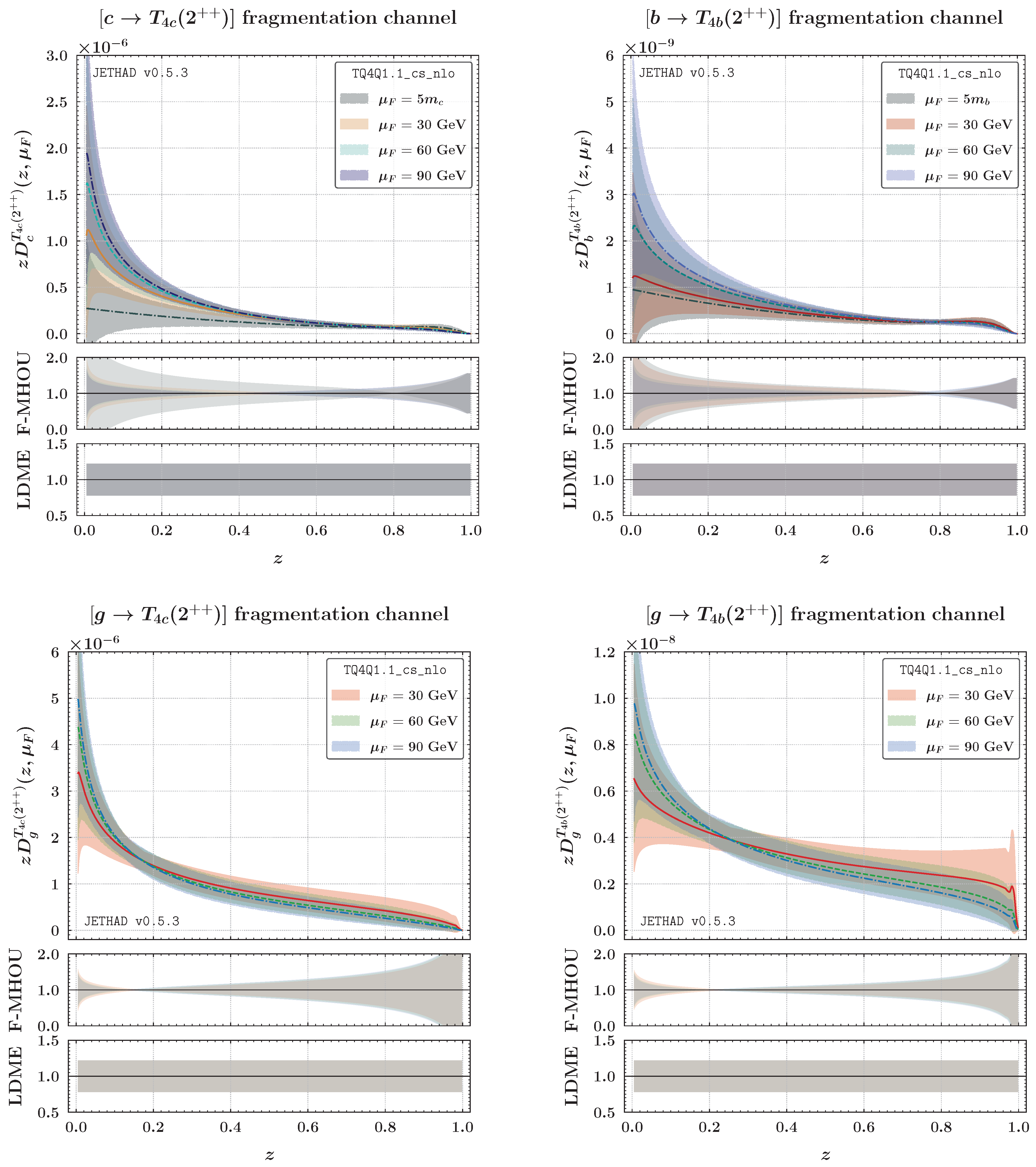 - Proton PDFs. Since collinear PDFs are genuinely nonperturbative inputs extracted from global fits, they introduce an additional source of uncertainty. Dedicated numerical tests for tetraquark-jet production, however, indicate that differences among PDF sets or replicas remain below the level. Therefore, we adopt the central member of the NNPDF4.0 set [485,486] and neglect the broader PDF-fit uncertainty, which is subdominant compared to MHOUs and LDME variations.
