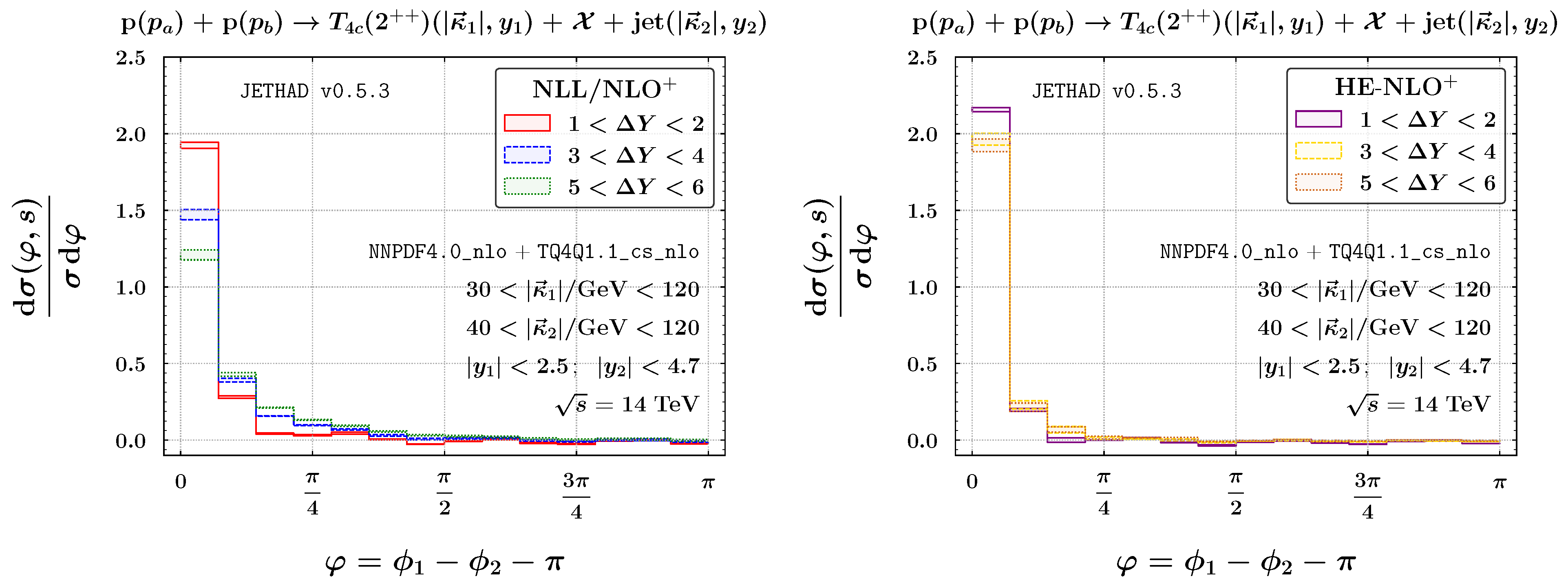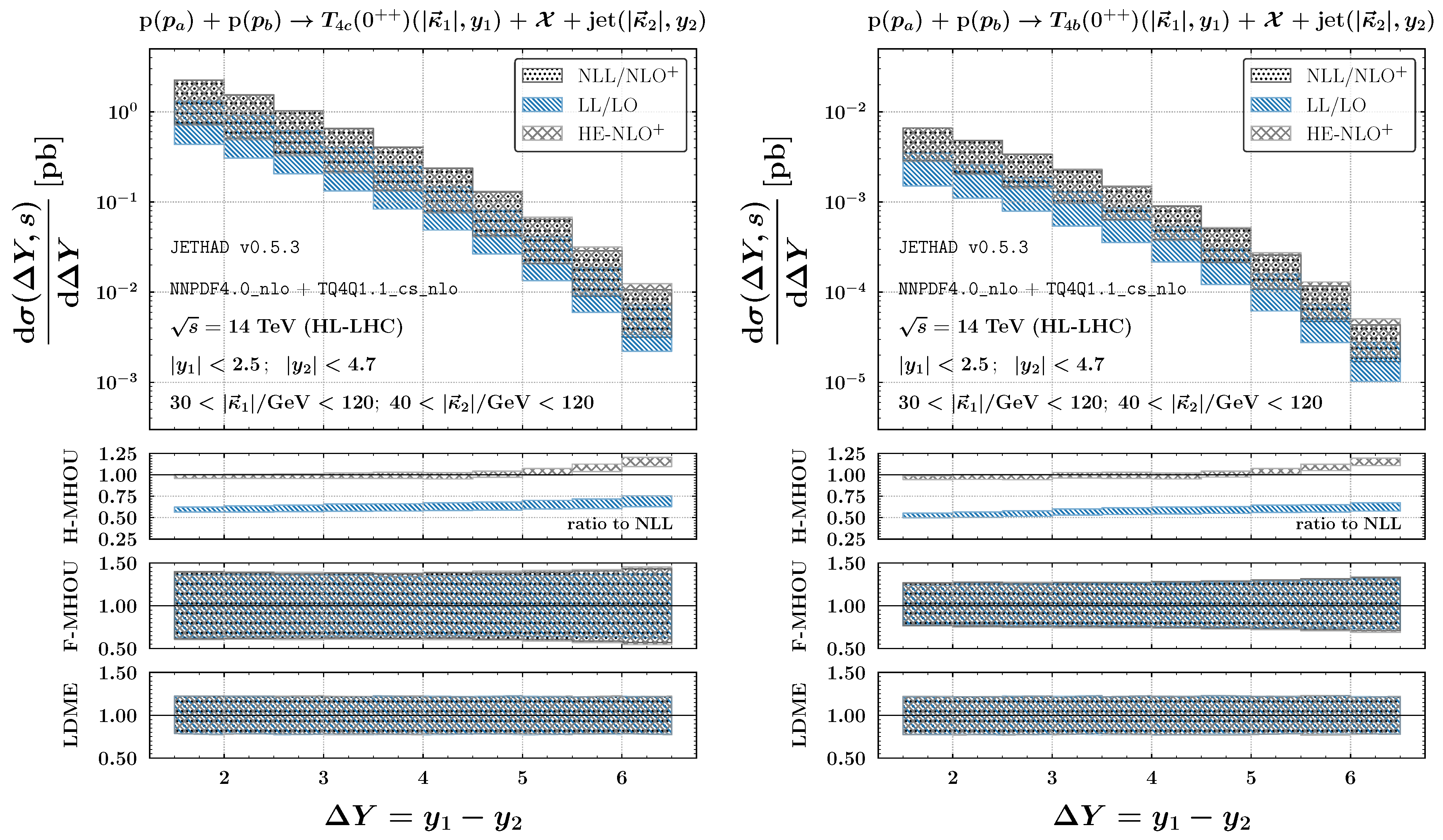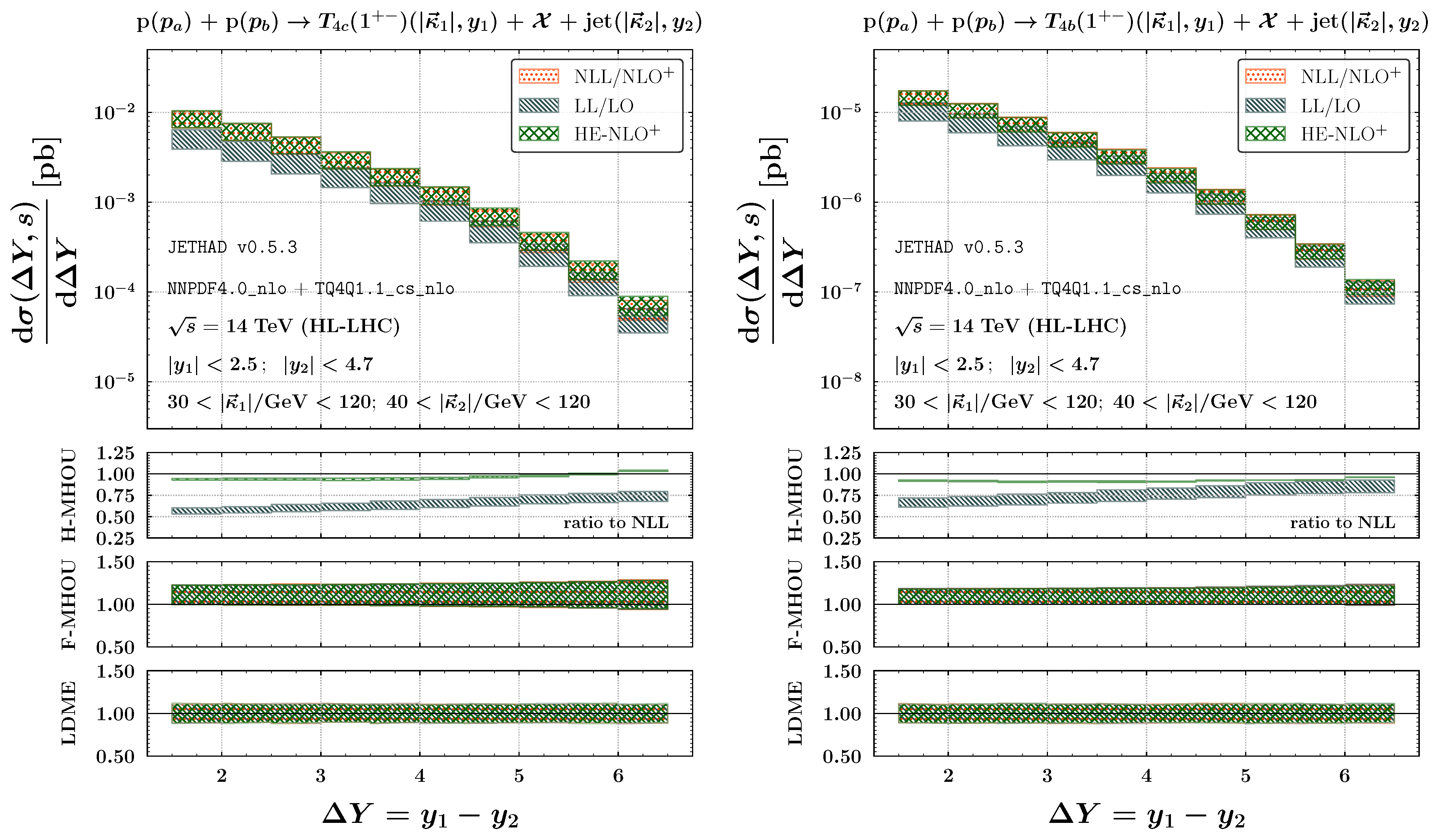 - Phase-space numerical integration. The leading numerical uncertainty arises from multidimensional integrations over the final-state phase space. These are performed using the native routines of Jethad, with relative errors systematically kept below the level. Subdominant effects originate from one-dimensional integrations over the partonic longitudinal momentum fractions x, which enter the convolution of PDFs and FFs in the LO and NLO tetraquark emission functions (see Equation (23)). Extensive stability tests confirm that these contributions are negligible with respect to the multidimensional integration uncertainty.