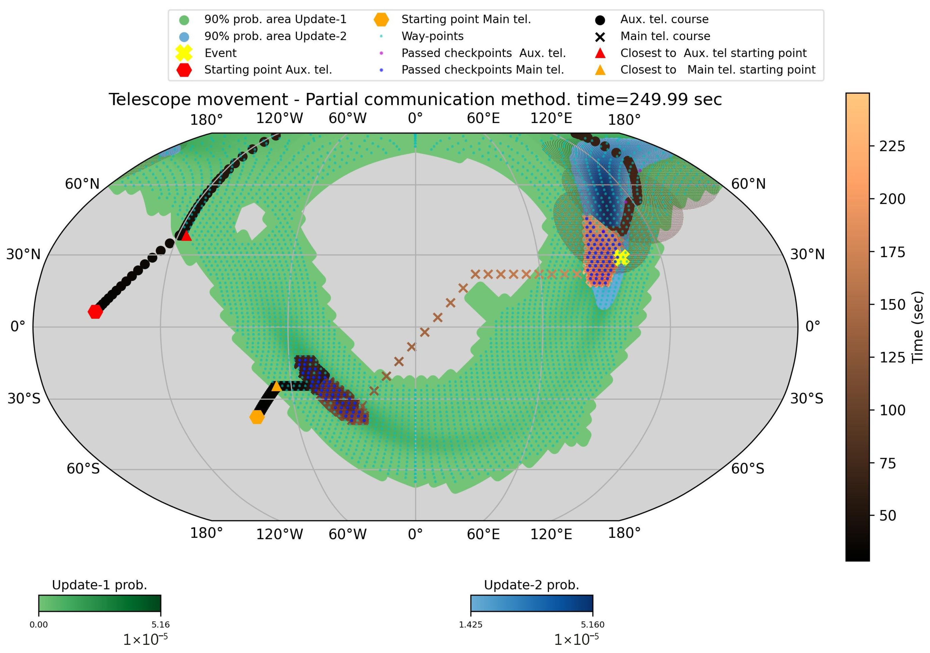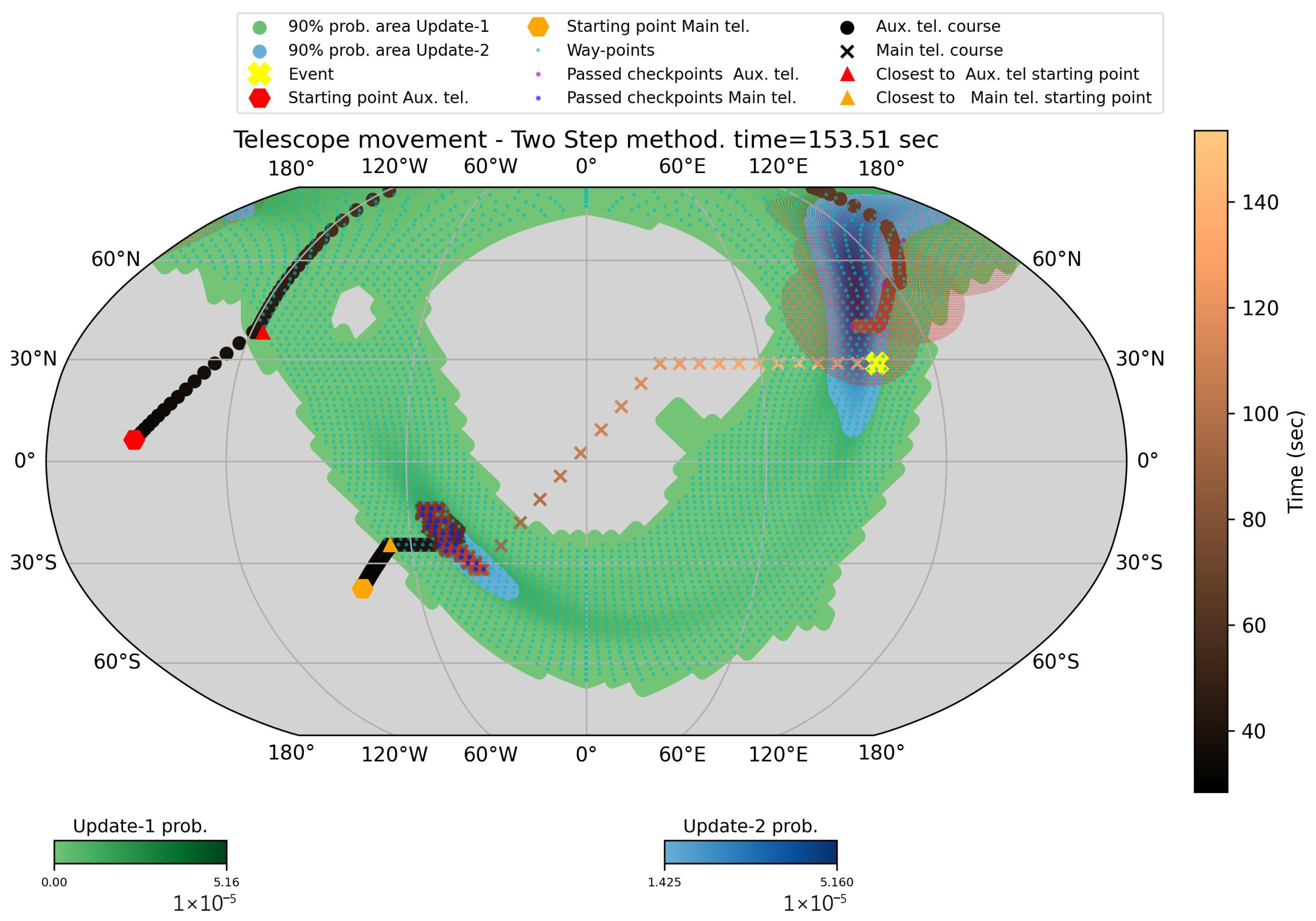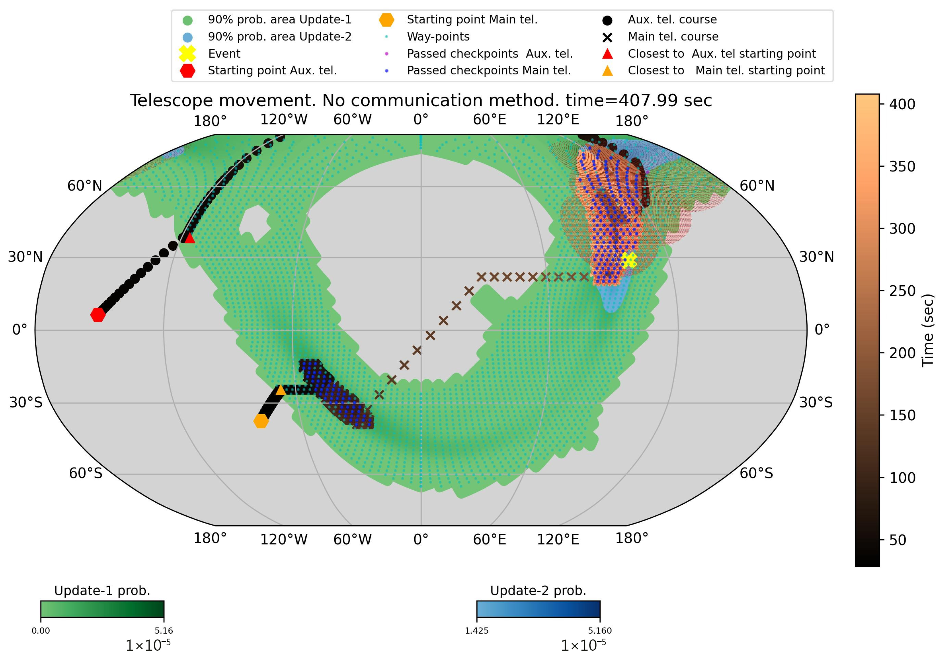 | s | s | Fourth sky-map update (blue). SNR = 10.5, area = . Slews toward upper-right of the search area. | Fourth sky-map update (blue). SNR = 10.5, area = . Slews toward bottom-left of the search area. |