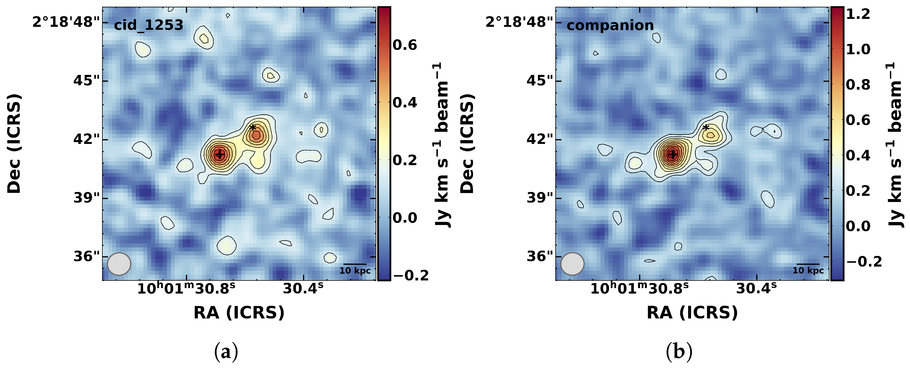 - Lee, K.; Kohno, K.; Hatsukade, B.; Egusa, F.; Yamashita, T.; Schramm, M.; Ichikawa, K.; Imanishi, M.; Izumi, T.; Nagao, T.; et al. Massive Molecular Gas Companions Uncovered by Very Large Array CO(1-0) Observations of the z = 5.2 Radio Galaxy TN J0924-2201. Astrophys. J. 2023, 944, 35. [Google Scholar] [CrossRef]