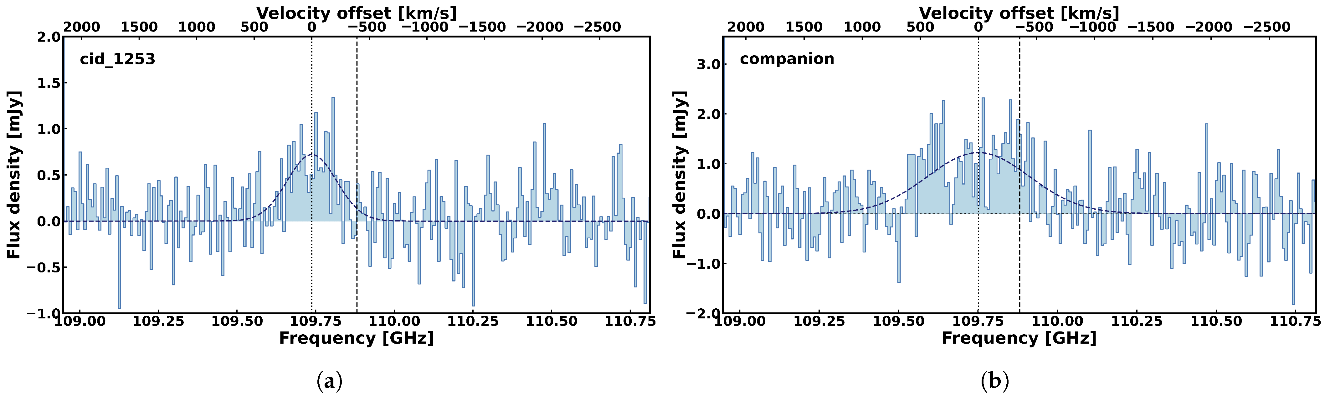 - Xu, F.; Wang, R.; Li, J.; Neri, R.; Pensabene, A.; Decarli, R.; Shao, Y.; Bañados, E.; Cox, P.; Bertoldi, F.; et al. Constraining the Excitation of Molecular Gas in Two Quasar-starburst Systems at z ∼ 6. Astrophys. J. 2024, 977, 190. [Google Scholar] [CrossRef]