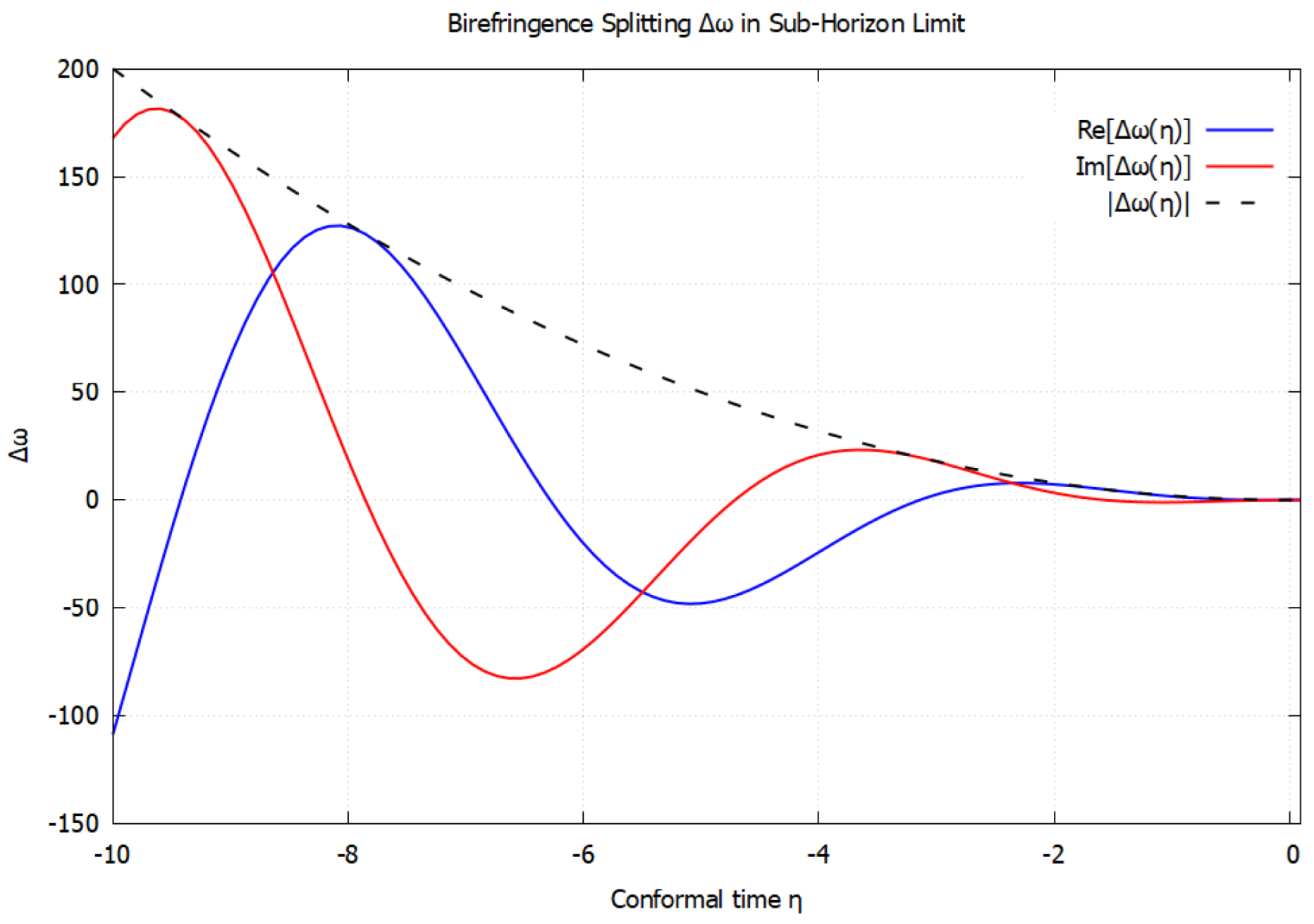 Figure 1. The birefringence effect ( Δ ω ) versus conformal time ( η ) in the sub-horizon limit. The red line shows the imaginary part, and the blue line shows the real part for the calculated birefringence. The dashed line is the absolute value for Δ ω , which envelops the real and imaginary parts.