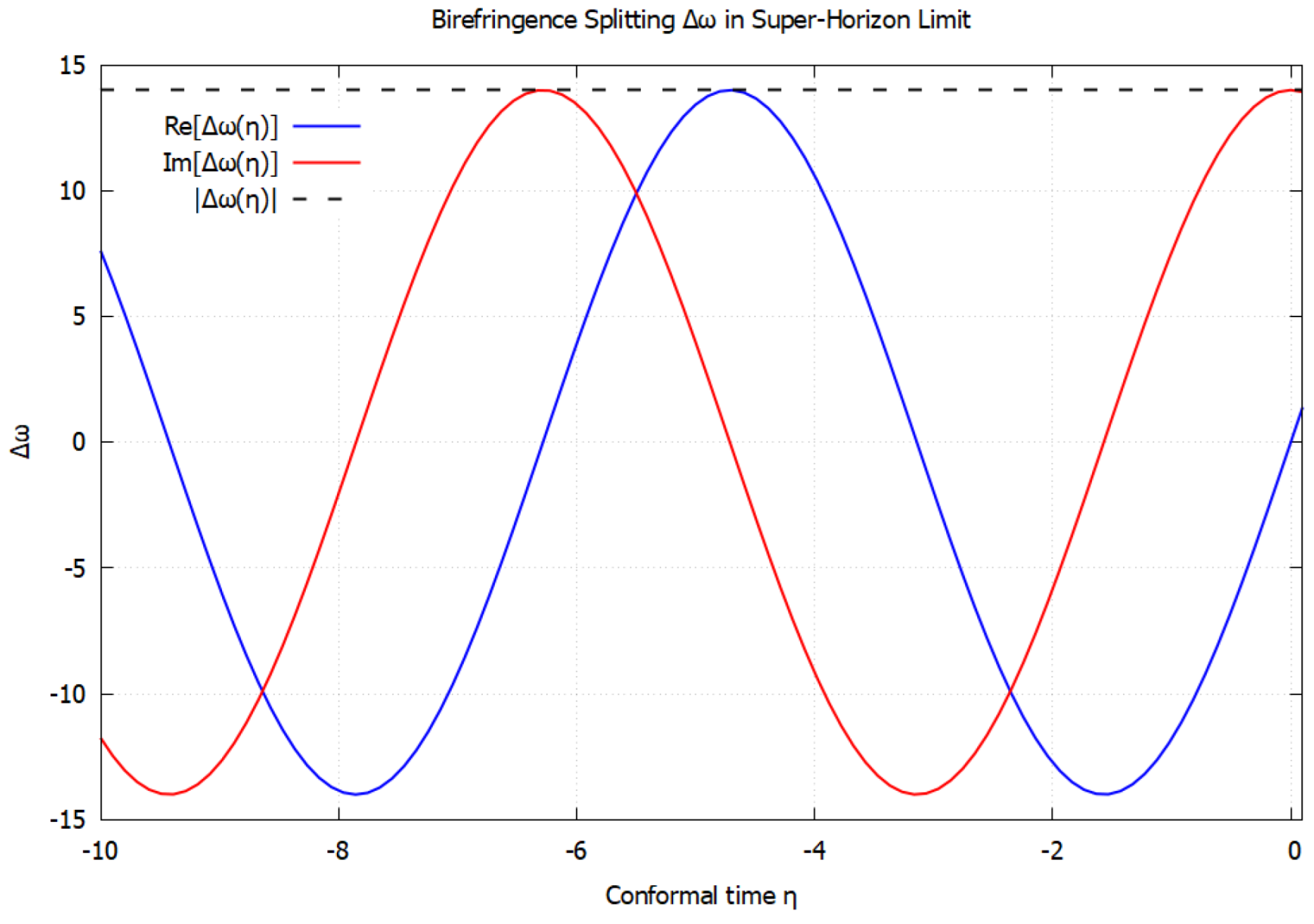 Figure 2. The birefringence effect ( Δ ω ) versus conformal time in the super-horizon limit. The red line again shows the imaginary part and the blue the real part, with the dashed line indicating the constant total magnitude.