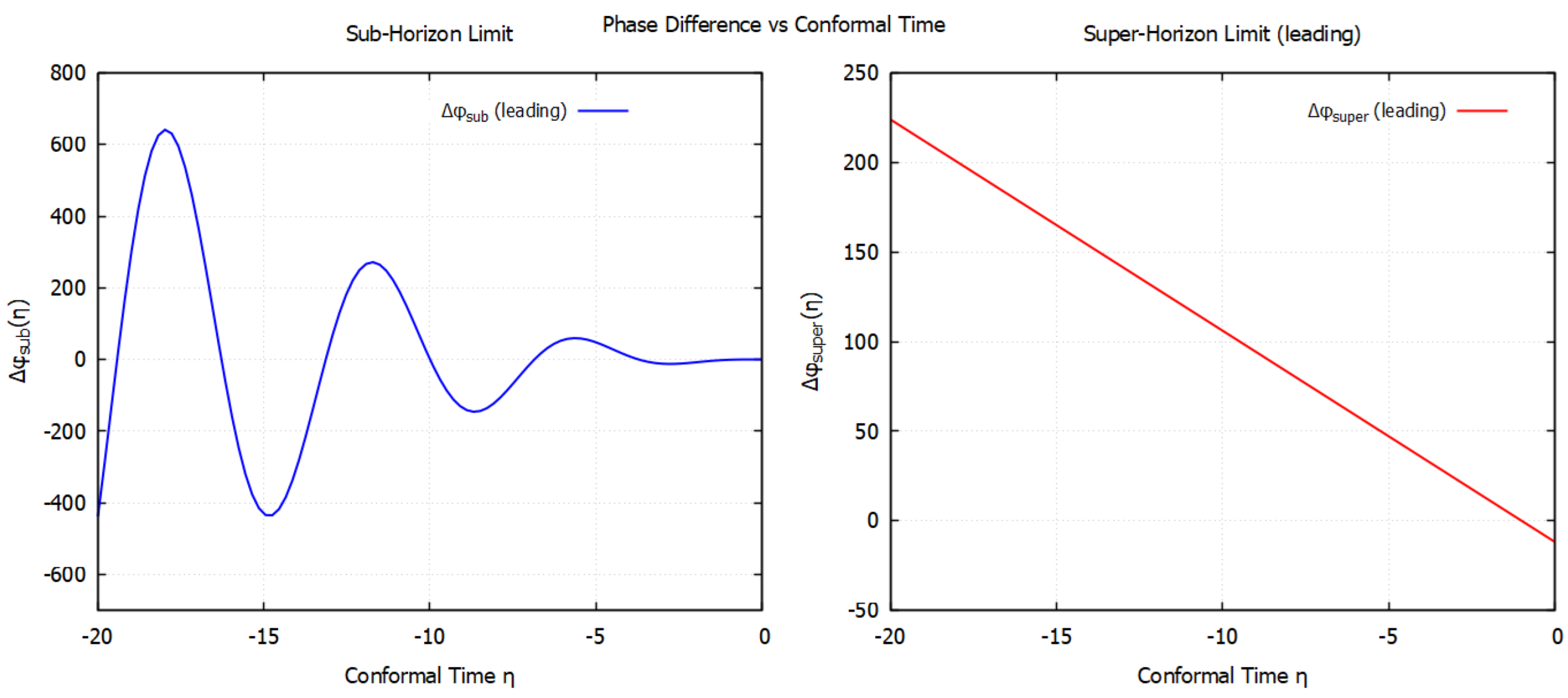 Figure 3. The leading order phase differences ( Δ ϕ ) versus conformal time for both the sub- and super-horizon limits (in arbitrary units). The plot on left for the sub-horizon limit shows the quadratic dependence ( η 2 ). The plot on right for the super-horizon limit shows the decaying parts as conformal time reaches the far future ( η 0 ).