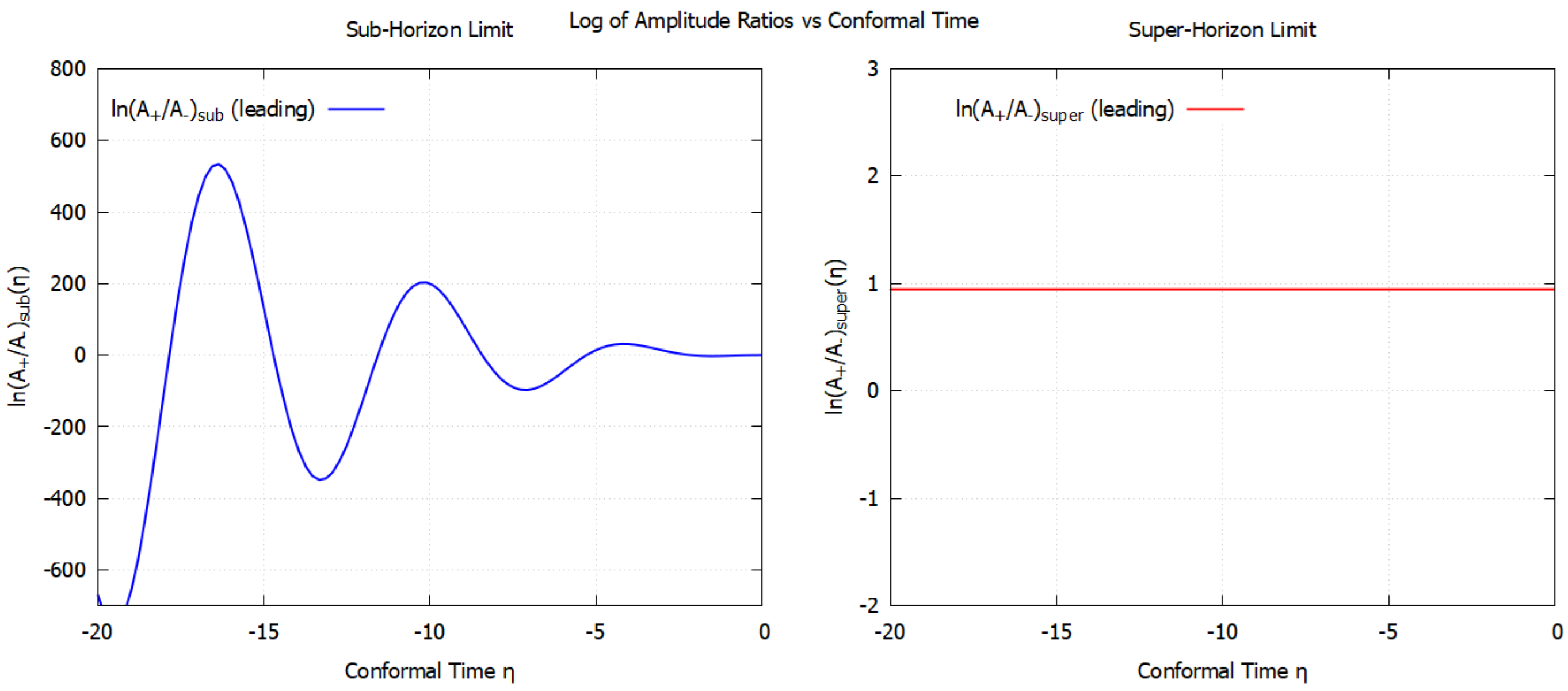 Figure 4. The ratio of the log of amplitudes in the leading order, ln A + / A versus conformal time ( η ) for both the sub- and super-horizon limits. The plot on left for the sub-horizon limit shows the quadratic dependence ( η 2 ) and enveloped by an oscillatory term. The plot on right for the super-horizon limit shows the constant frozen-in amplitude difference that remains etched in the distant future ( η 0 ).