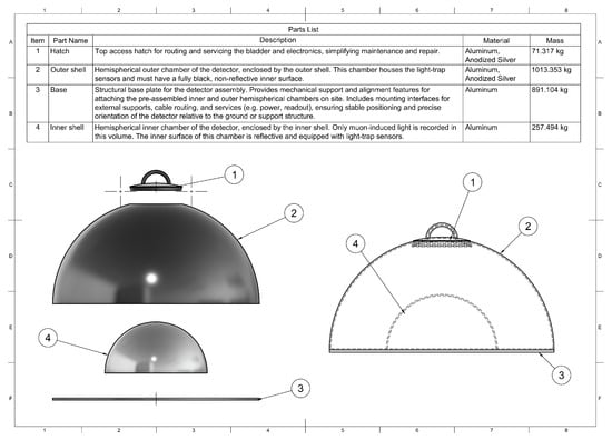 Exploded view of the hemispherical detector unit and associated parts list. The assembly is composed of (1) a top access hatch for routing and servicing the bladder and electronics, (2) the outer aluminium shell forming the upper, optically black chamber, (3) a structural base plate that supports the detector on site and provides interfaces for services and cabling, and (4) the inner aluminium shell forming the lower, reflective chamber where muon-induced light is recorded.