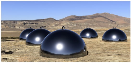 Illustrative rendering of several hemispherical detector units deployed on a high-altitude plateau, representing a possible configuration of the outer array. The compact, low-profile aluminium shells are designed for simple placement on prepared foundations, with the instrumented bladders inserted from the top hatch after installation and connected to power and readout services via standardised external interfaces.