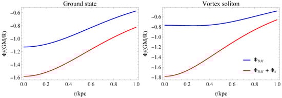 The gravitational potential with and without baryonic matter in ground (left) and vortex (right) cases. We take for the vortex state.