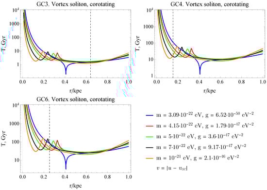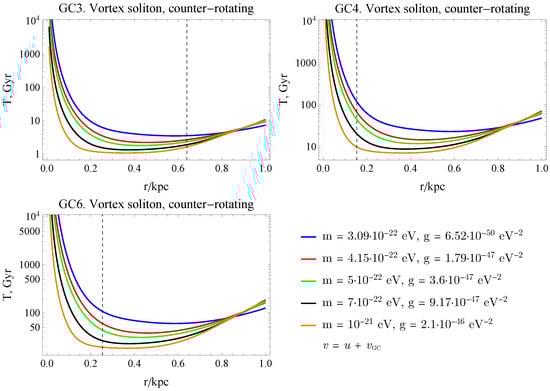 The characteristic time when GC changes notably its velocity for the soliton vortex state of ULDM and a few values of bosonic particle mass m with the corresponding value of g as a function of its position r from the galactic center. The direction of rotation of the BEC and the GC is opposite, and the dotted vertical line shows the current position of a globular cluster.