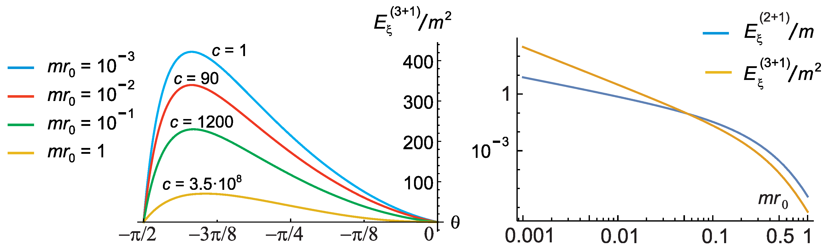 ; see left panel). Furthermore, a comparison of the induced vacuum energy in three- and two-dimensional space-time for the partial case of a boundary condition parameter of