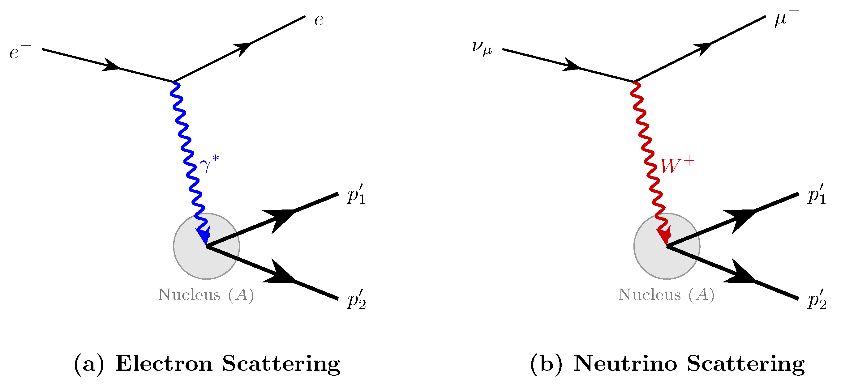 , which encodes the nuclear dynamics. In addition to one-body processes, further contributions arise from 2p2h excitations induced by two-body electroweak currents. In these mechanisms, the exchanged boson interacts with a pair of nucleons, leading to the emission of two nucleons from the nucleus, as schematically illustrated in