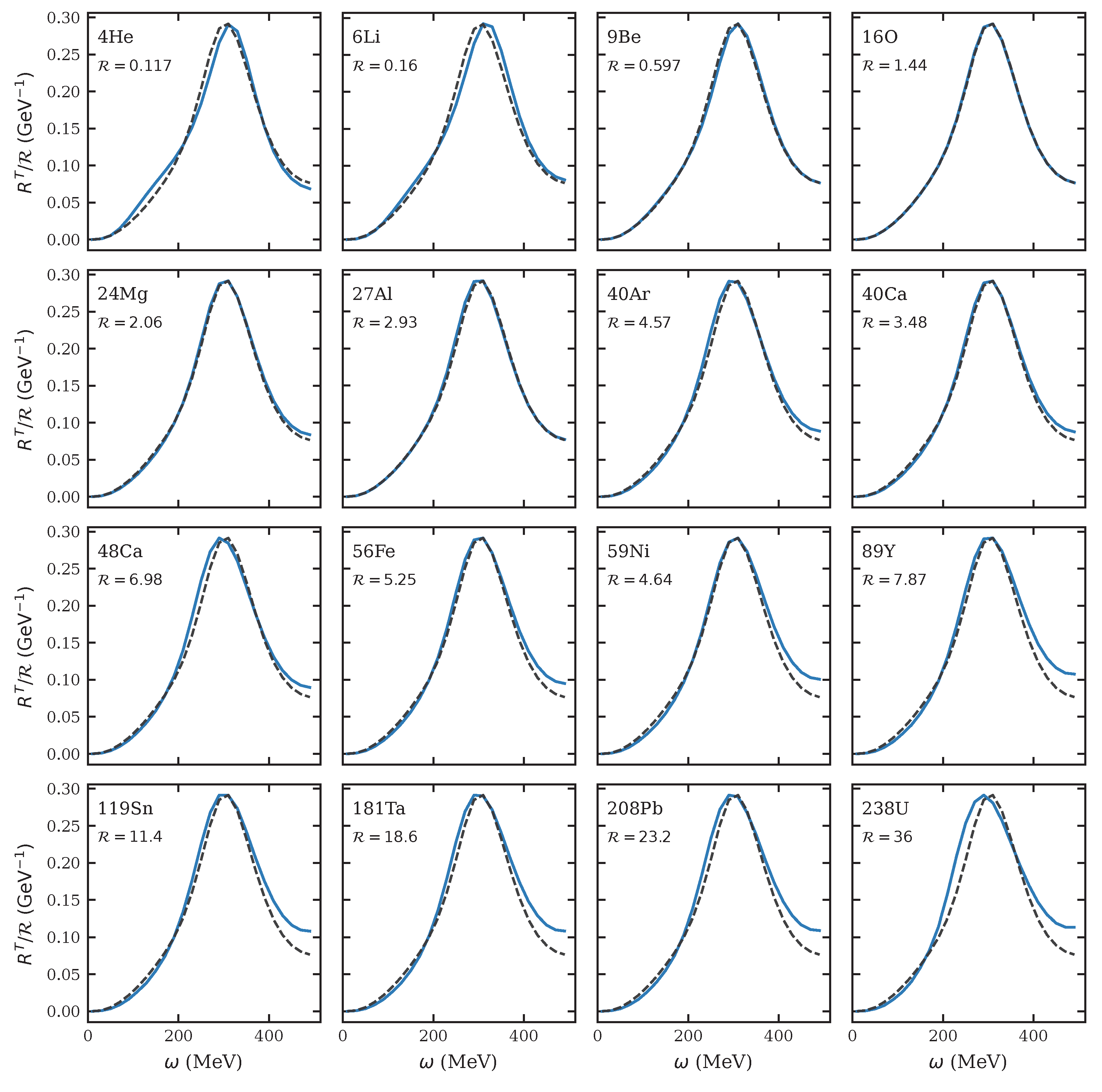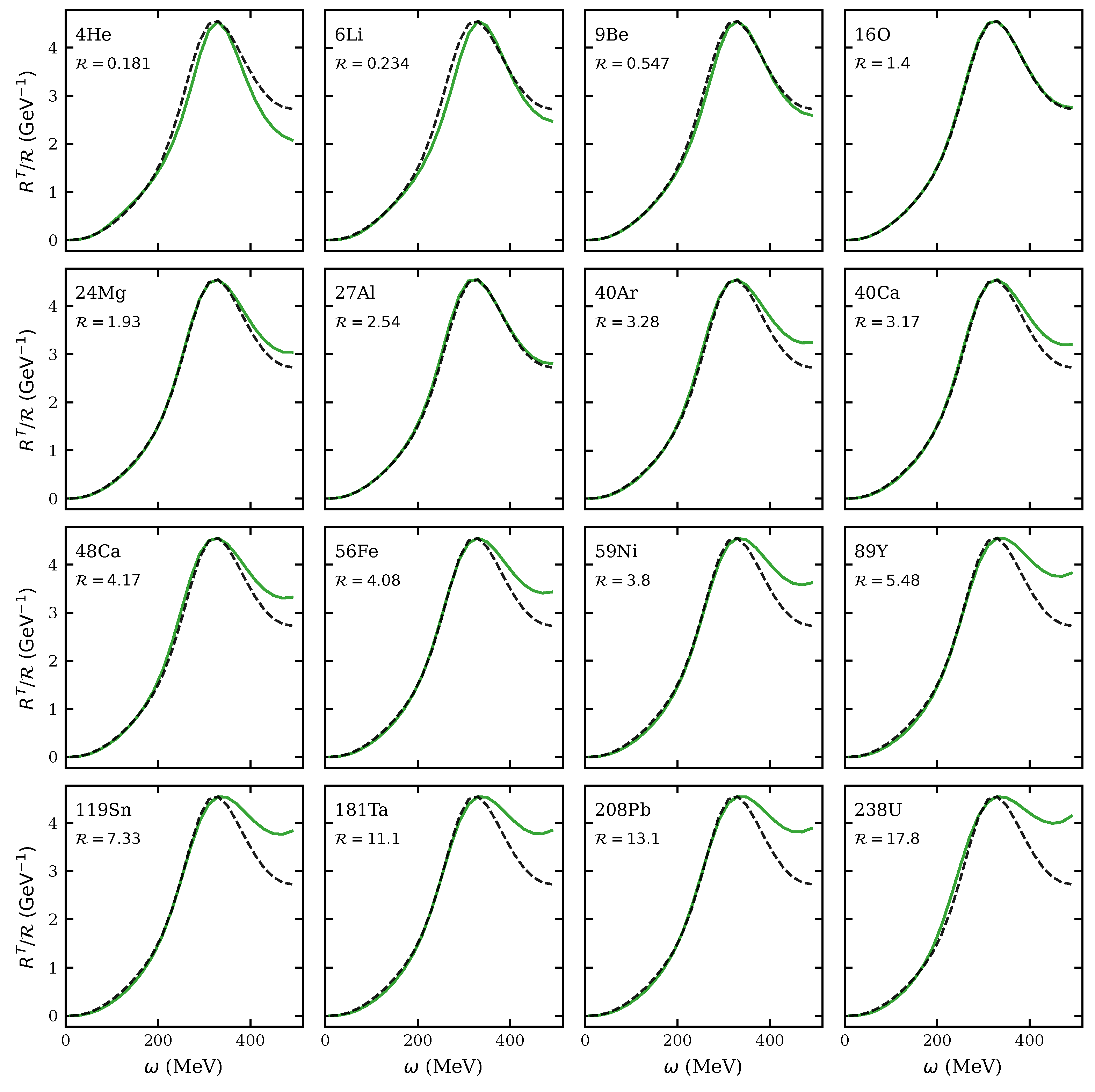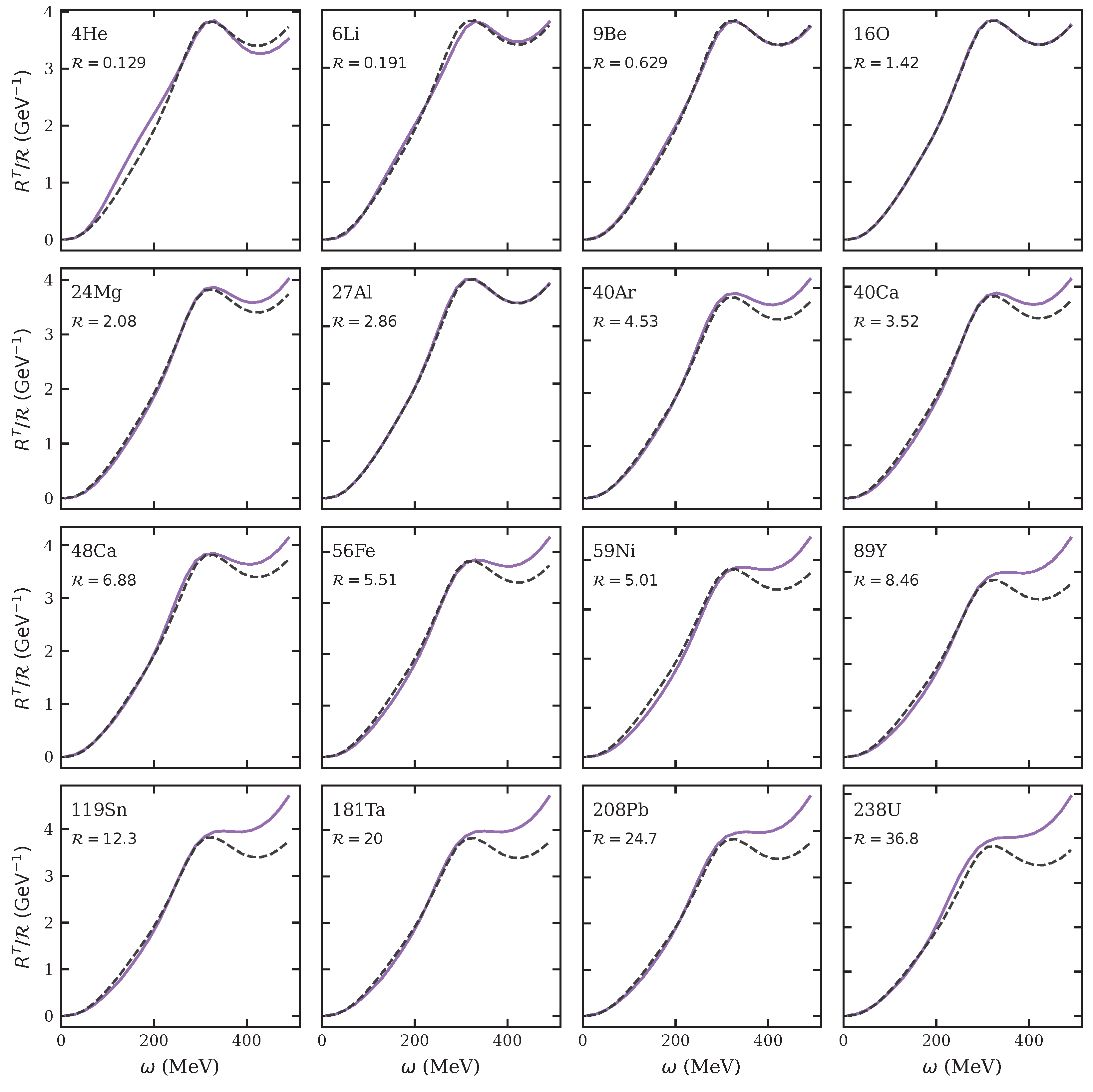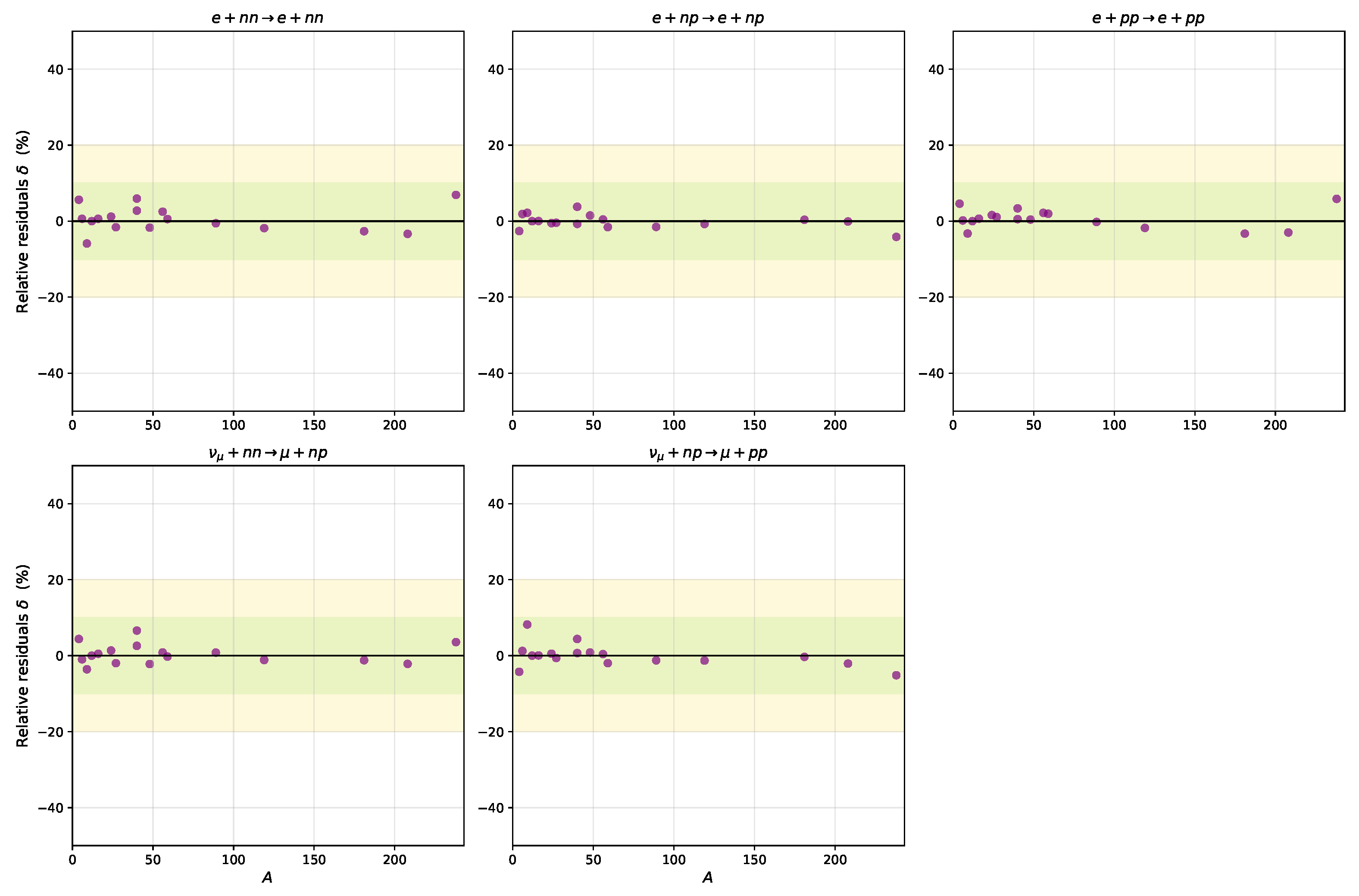 It is important to emphasize, however, that the present parametrization is not intended to reproduce the microscopic 2p2h response of a specific nucleus-which is obtained from the underlying RMF calculations—but rather to describe how this response evolves across different nuclear targets over a wide mass range. To quantify the quality of the fit over this nuclear range, a quantitative validation is therefore performed through the analysis of the relative residuals shown in