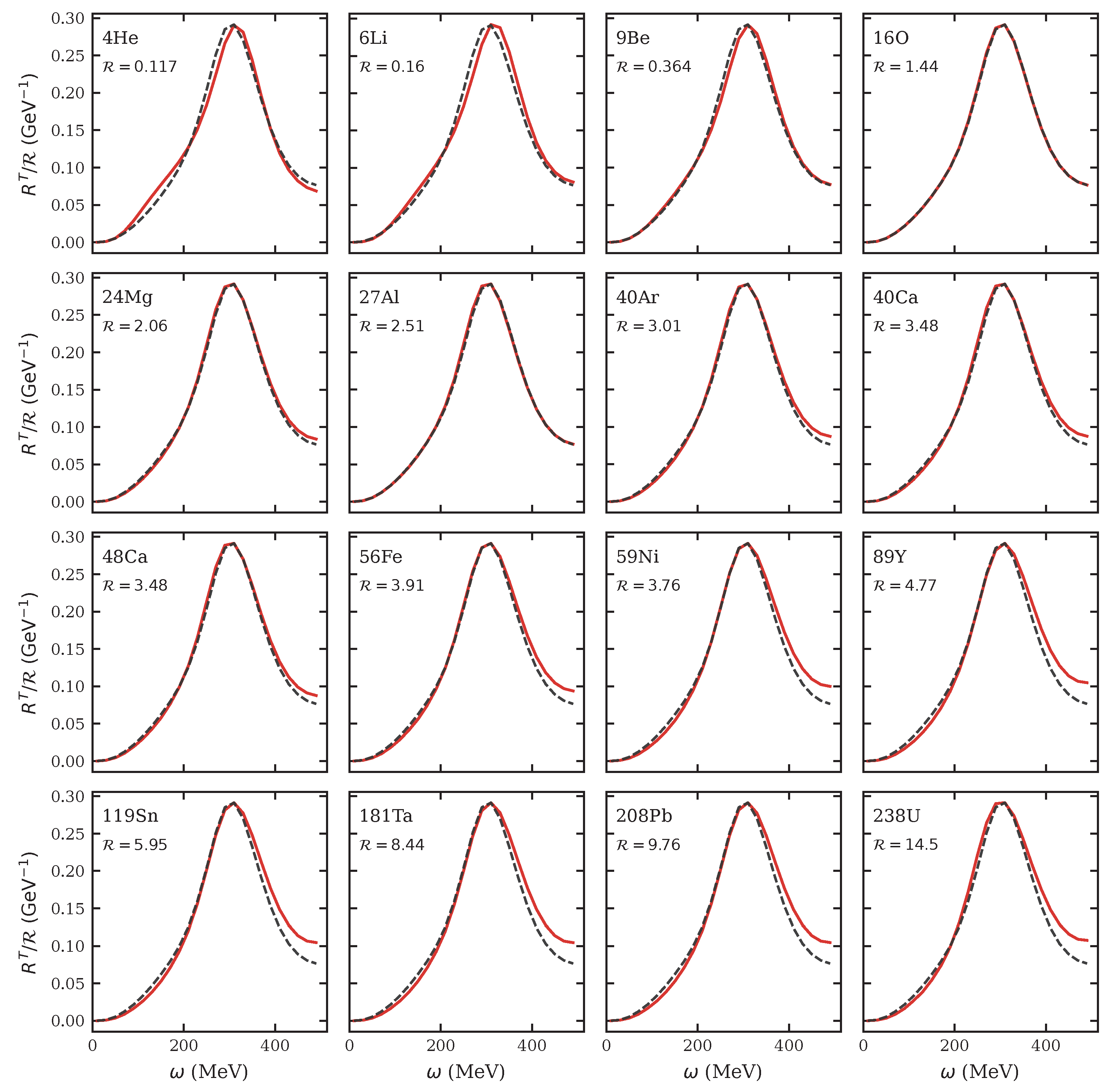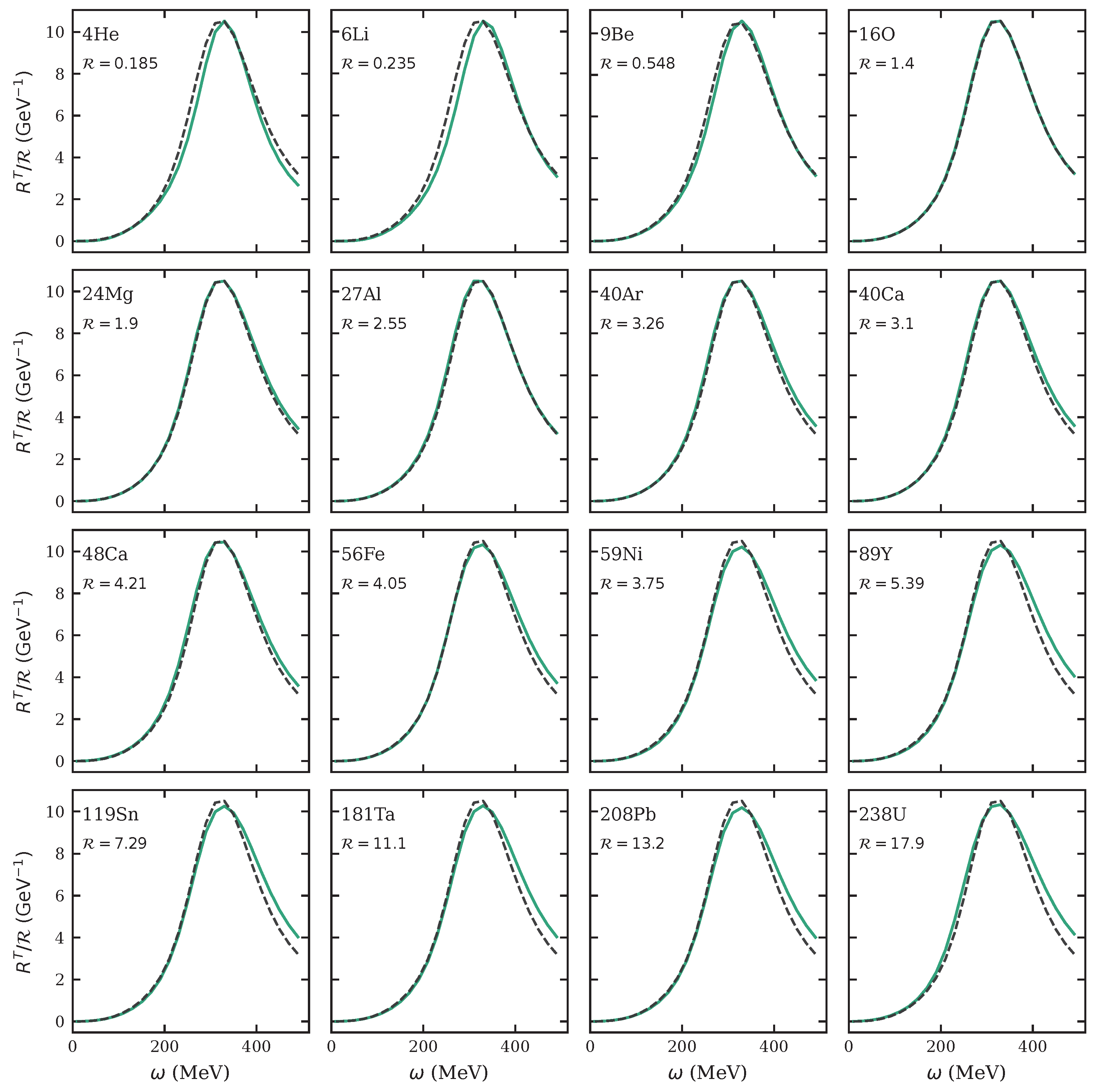 21], to an extensive set of seventeen nuclei. This set spans from light systems, such as lithium and helium, to heavy nuclei such as lead and uranium, thereby covering the full mass range relevant for neutrino scattering experiments and for inclusive electron scattering for which experimental data exist for a wide variety of nuclei [