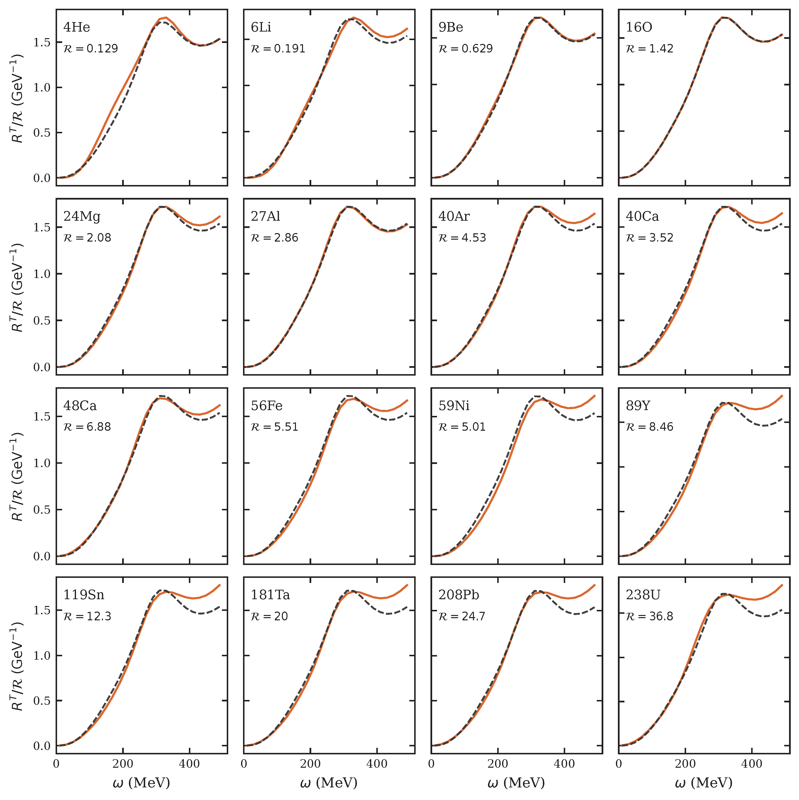 While the volume and phase-space factors can be computed using analytical expressions, the reduced response involves a much more complex dynamical structure. For this reason, all the remaining nuclear dependence is collected in the reduced-response scaling function term