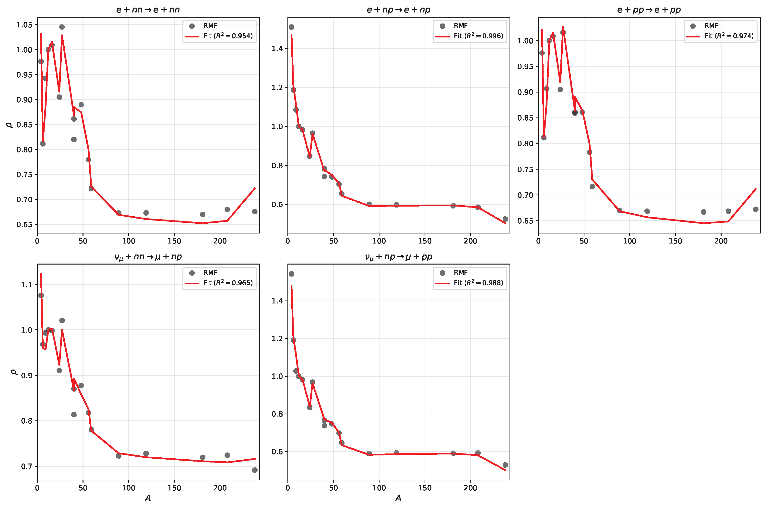 On the basis of these observations, we adopt a factorized form for the scaling ratio, separating volume and reduced phase-space contributions and collecting the remaining nuclear dependence in a reduced-response scaling function . We parametrize using the proton and neutron Fermi momenta and the RMF effective mass, obtaining a compact representation of the microscopic results across nuclei rather than a statistical fit in the strict sense.