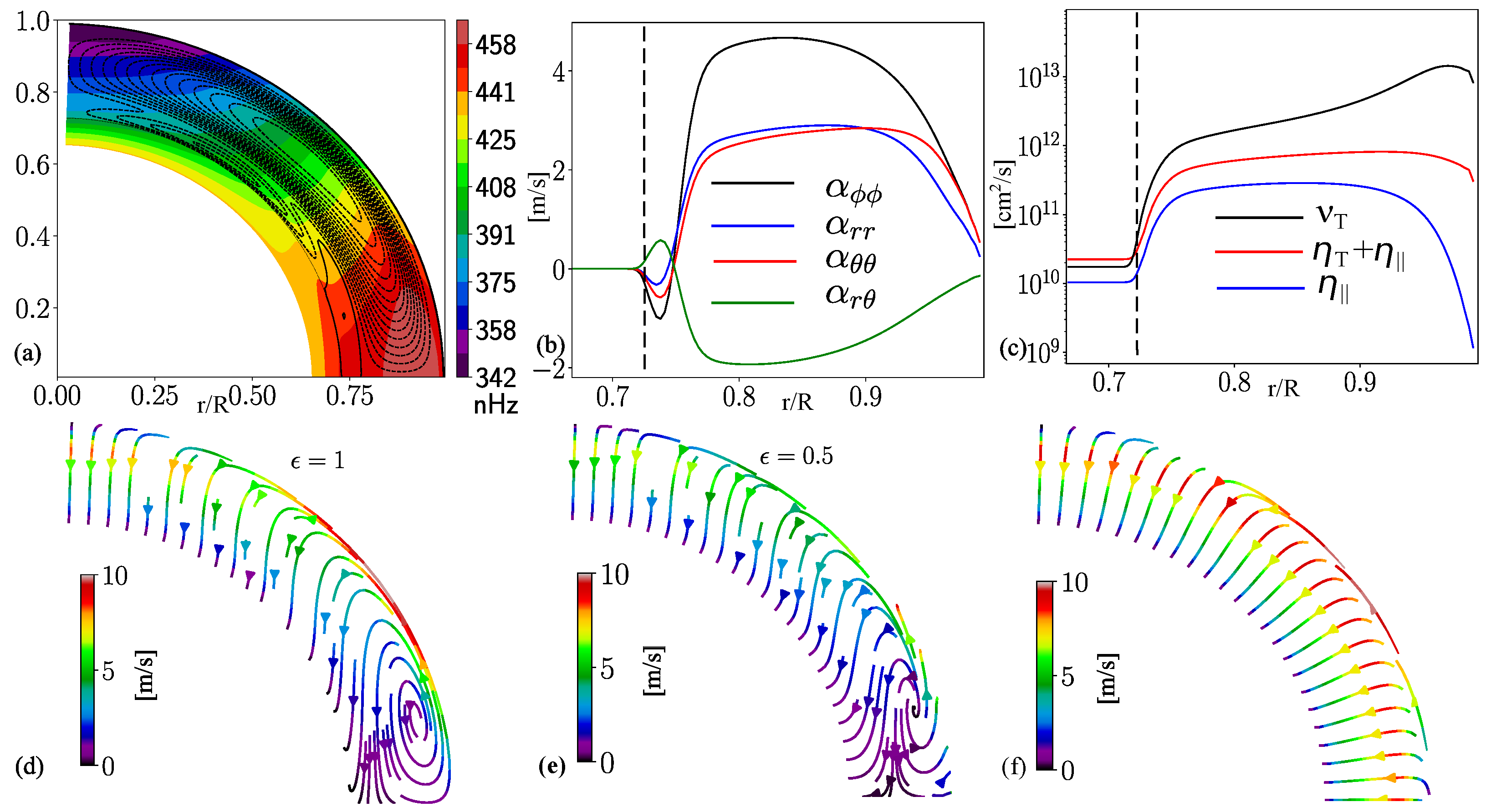 Figure 1. (a) The meridional circulation (streamlines) and the angular velocity distributions, where the magnitude of circulation velocity is 13 m/s on the surface at a latitude of 45°; (b) the α -effect tensor distributions at a latitude of 45°, where the dashed line shows the convection zone boundary; (c) radial dependencies of the total, η T + η | | , and the rotational induced part, η | | , of the eddy magnetic diffusivity and the eddy viscosity profile, ν T ; (d) streamlines of the effective drift velocity of large-scale toroidal magnetic field due to the turbulent pumping and the meridional circulation for the case of equipartition between the intensity of the magnetic fluctuations and turbulent motions, ϵ = 1 ; (e) the same as (d) when the energy of the magnetic fluctuations is less by factor of two than the energy of turbulent flows; (f) streamlines of the effective drift velocity of the large-scale poloidal magnetic field. We use numpy/scipy [30,31] together with matplotlib [32] for post-processing and visualization.