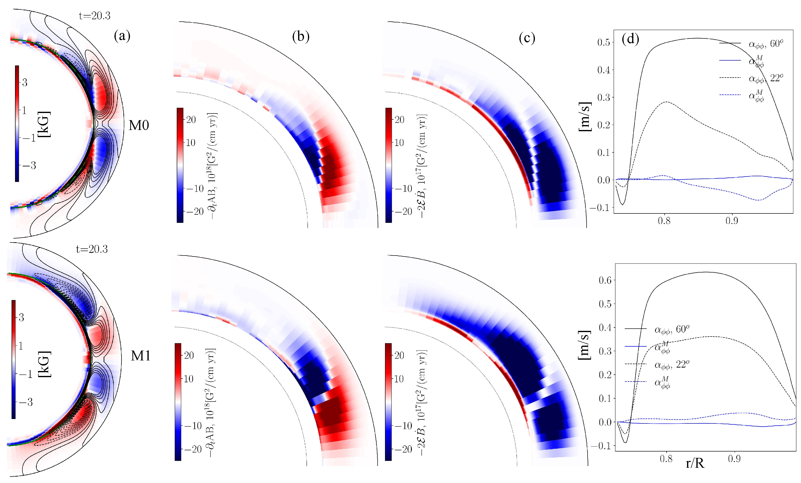 Figure 3. Snapshots of models M0 and M1 for the decaying phase of the magnetic cycle: (a) large-scale magnetic field distribution, with the colored image showing the toroidal magnetic field and the line graphs showing the poloidal magnetic field, noting that the magnetic field is almost antisymmetric about the equator; (b) small-scale magnetic helicity density generation rate by the large-scale dynamo; (c) the same as (b) for the α -effect contribution; (d) the radial profiles of the α -effect for the northern hemisphere, where α ϕ ϕ M shows the contribution of the small-scale magnetic helicity. For the southern hemisphere the patterns shown in (bd) revert the sign.