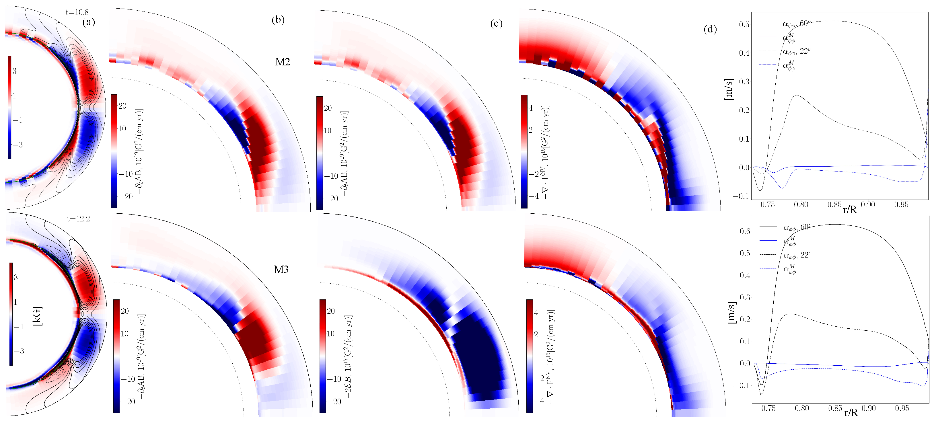 Figure 4. The same as Figure 3 for models M2 and M3. Here, column (d) shows the new Vishniac flux contribution, 𝛁 · F NV . Note the substantial changes in the alpha-effect near the bottom of the convection zone and at high latitude near the surface. Animations of this figure show variations in the magnetic field and the helicity generation rate distributions, as well as variations in the α -effect profiles during 3 magnetic cycles of runs M2 and M3. For the southern hemisphere, the patterns shown in (bd) revert the sign.