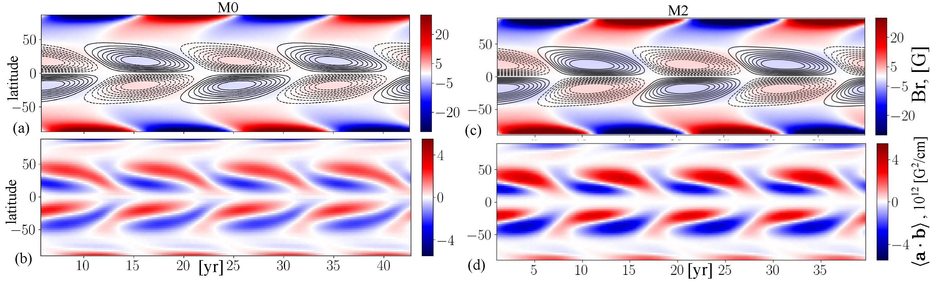 Figure 5. (a) Time–latitude diagrams of the large-scale magnetic field in model M0, with contours showing the toroidal magnetic field at r = 0.9 R ; (b) time–latitude diagram of the small-scale helicity density evolution at the surface; (c,d) show the same for run M2.