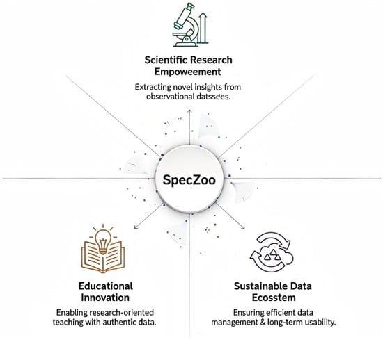 SpecZoo design philosophy. The platform integrates AI-powered analysis, educational innovation, and sustainable data management to address the challenges posed by large-scale spectral data.