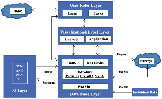 The AI Layer integrates machine learning methods for tasks including spectral classification, stellar feature extraction, calculation of stellar atmospheric parameters, and redshift measurements for galaxies and quasars. Computationally intensive operations run on a dedicated server, with results transmitted to the front-end for visualization and further analysis.