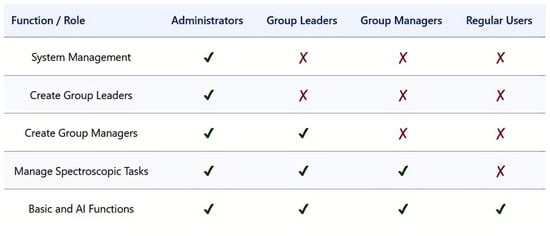Role Management. The Workgroup function serves as the cornerstone for collaborative work within SpecZoo. SpecZoo employs a hierarchical user-role system with four levels: administrators, group leaders, group managers, and regular users. Group leaders form teams and define spectroscopic tasks, group managers assist with task assignment and monitoring, and regular users have the flexibility to join multiple workgroups, where they can share data and engage in cooperation, thereby fostering a dynamic scientific community. This structure ensures organized collaboration and efficient task management. Specific permissions are as shown in Figure 3.
