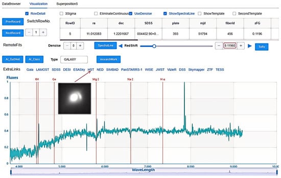SpecZoo facilitates the efficient identification of strong gravitational lens candidates in large spectroscopic surveys by integrating spectral analysis, interactive visualization, and cross-survey data access. Within the platform, researchers can examine spectra to detect multiple redshift components and identify characteristic emission lines from background galaxies (e.g., [O iii] , Ly). Its cross-survey linkage module enables rapid retrieval of high-resolution imaging data (e.g., Hubble Space Telescope (HST) deep-field observations [25]), allowing confirmation of lensing morphology such as Einstein rings, arcs, or multiple images.
