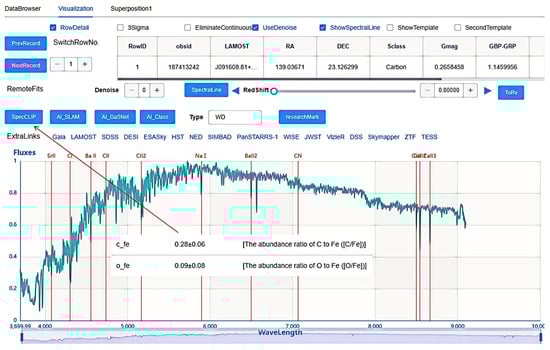 Based on the LAMOST survey for target selection, Li et al. [23] performed a homogeneous elemental abundance analysis of 385 very metal-poor stars using high-resolution spectra obtained with the Subaru Telescope [24] and incorporating Gaia parallax data, resulting in a target catalog. Here, we select a source (LAMOST obsid: 203105173) as an example for demonstration to showcase the interface and functionalities of SpecZoo, as demonstrated in Figure 6. The core interface of SpecZoo is organized into three main tabs. Upon entering the Visualization tab, users access Visualization functions for spectral display, denoising, and template fitting. The interface also features four dedicated AI buttons (as detailed in Section 3.2) that enable automated classification, parameter estimation, and feature extraction, alongside other fundamental tools for interactive spectral inspection; the Data Browser tab presents the dataset from uploaded CSV files in tabular form and incorporates filtering and bookmarking capabilities to facilitate rapid data retrieval, where selected entries can be directly visualized in the corresponding spectral interface; the Superposition tab is dedicated to spectral superimposition, enabling comparative analysis of multiple spectra from repeated observations of a single source as well as spectral comparisons across similar astrophysical objects.