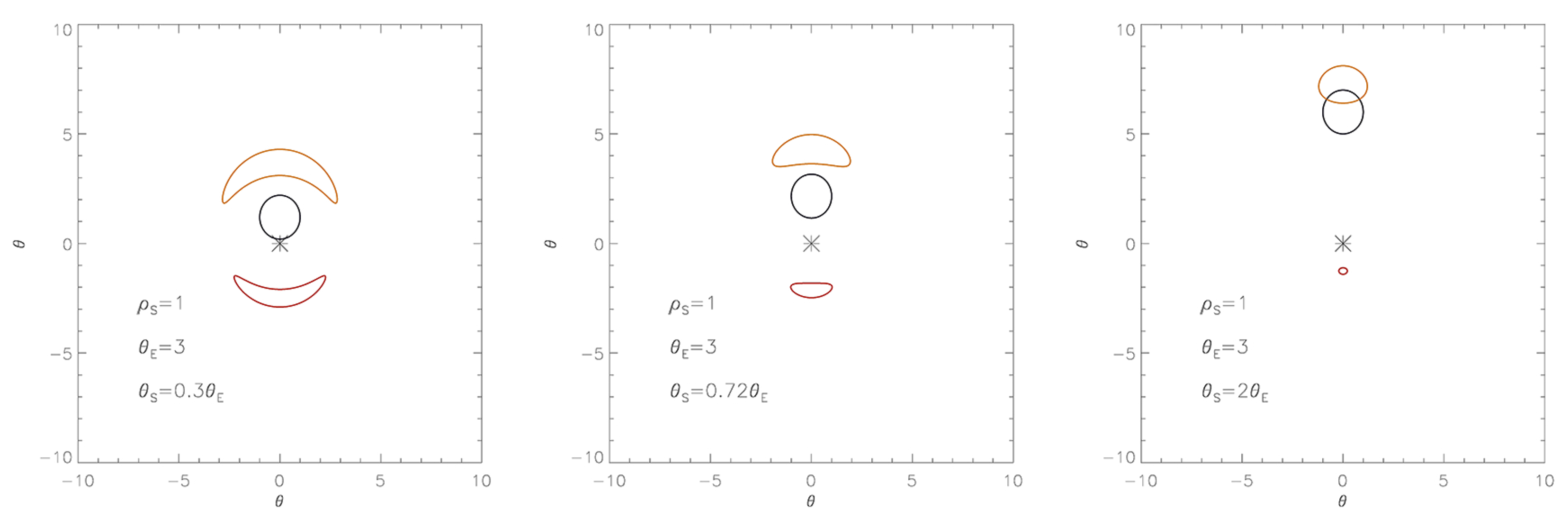 Here, we remind that all of the angular quantities are given in units of the Einstein angle , which, for a source at distance , results in being: