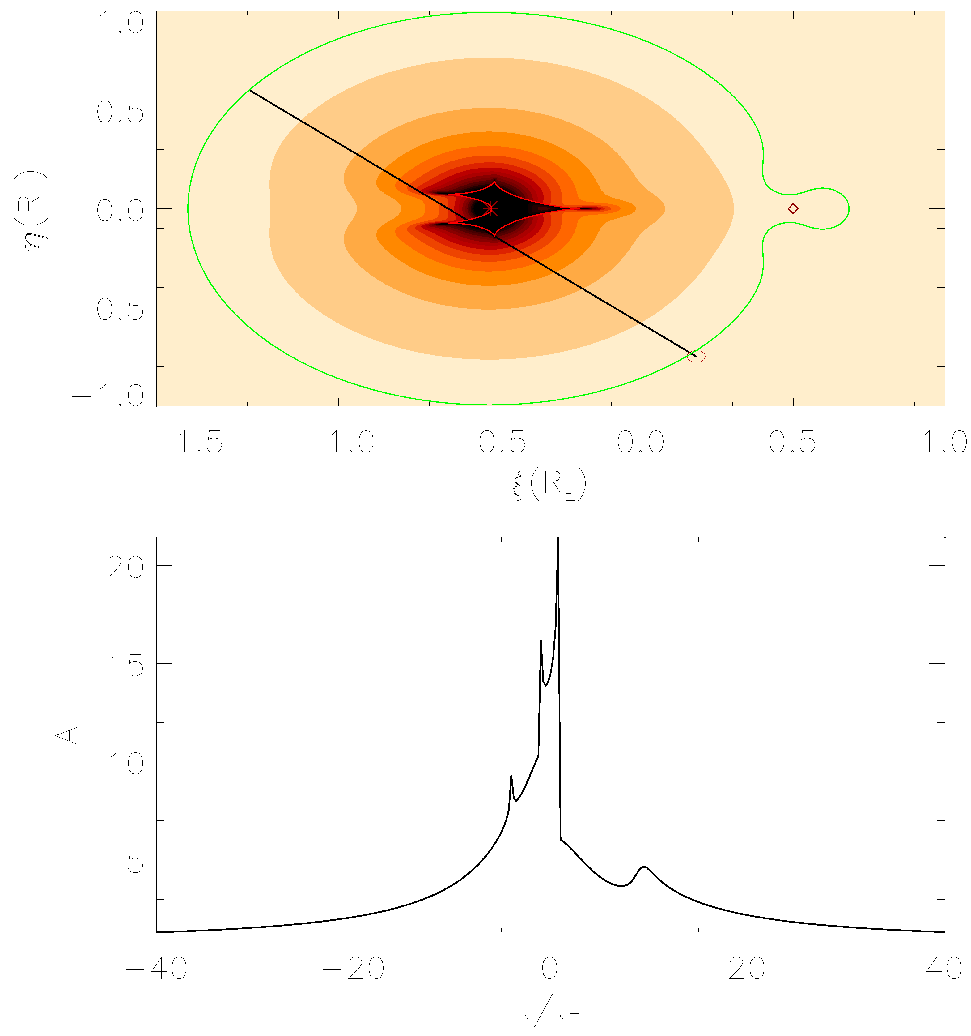 Magnification map for a binary lens system characterized by two objects separated by a projected distance of and mass ratio . The green and red closed lines indicate the critical and caustic curves obtained by solving the lens equation in Equation (1). The black line indicates the trajectory of the source star, which has a radius of . The simulated light curve is shown in the lower panel.