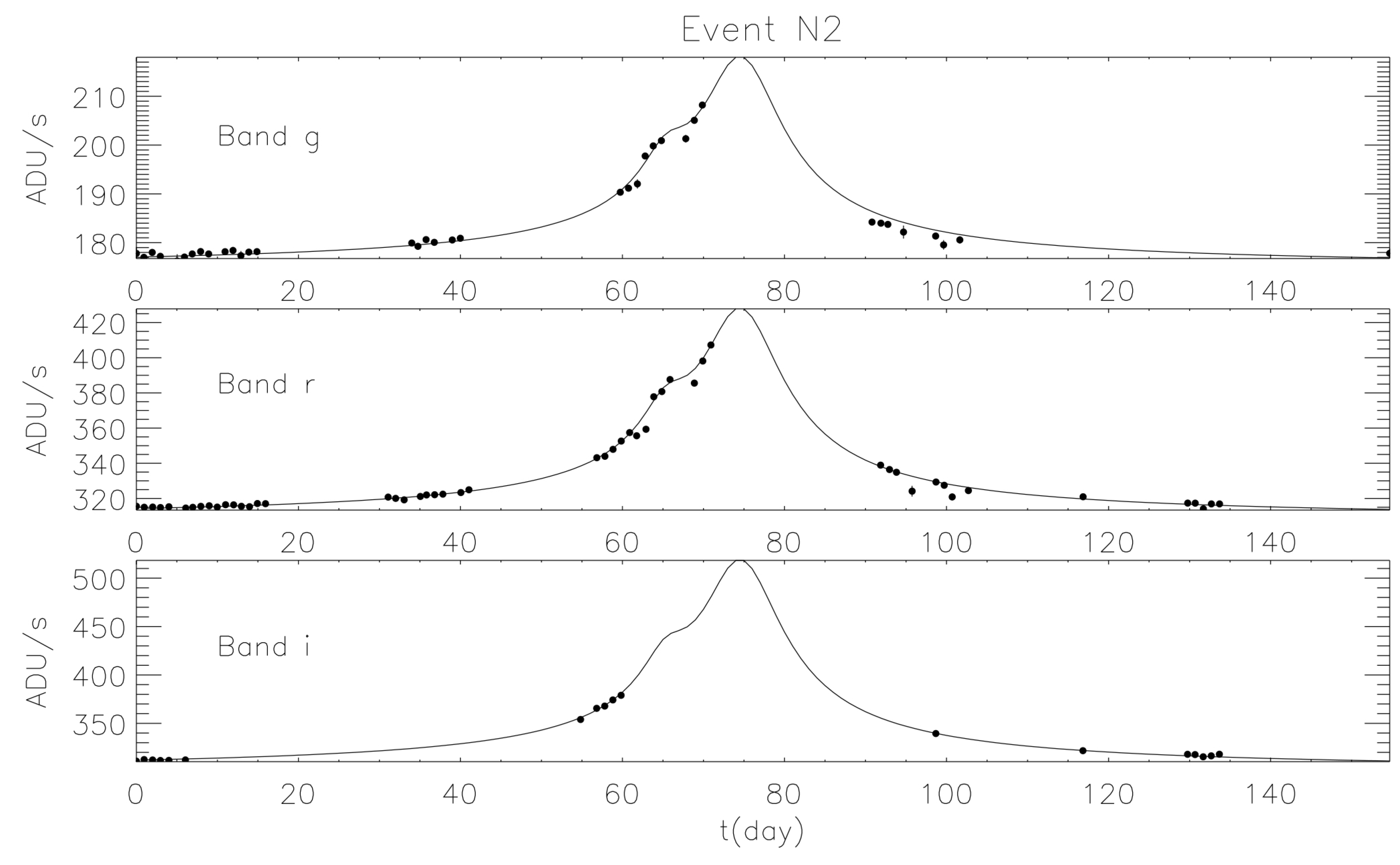 Light curve in three different bands (g, r and i) of the PA99-N2 event detected in 1999 toward the Andromeda galaxy.