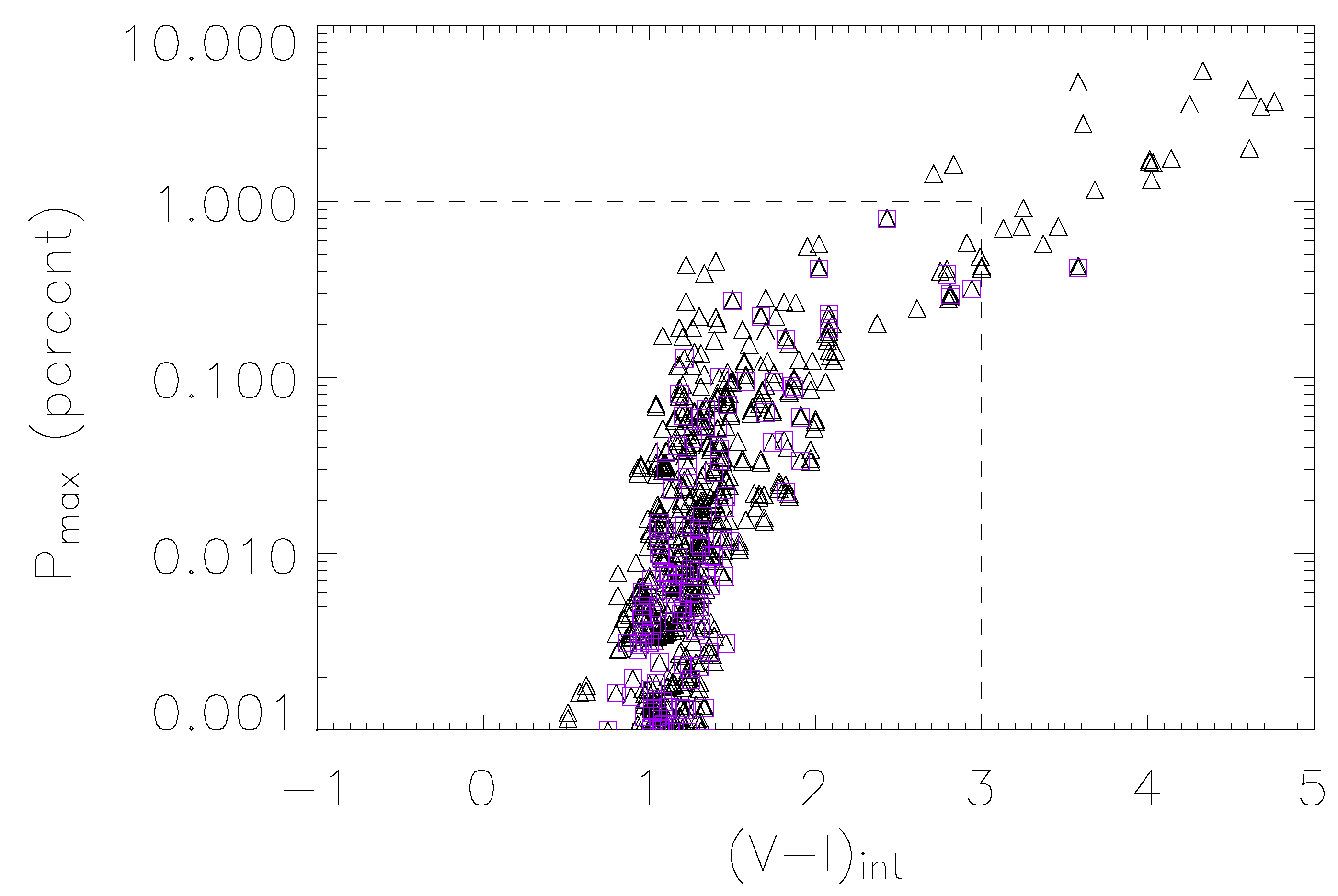 Distribution of the peak value of the polarization signal as a function of the intrinsic color index of the source star for simulated transit (triangles) and bypass (purple squares) events. The dashed lines indicate the region in which the events observed by the OGLECollaboration are expected to lie.