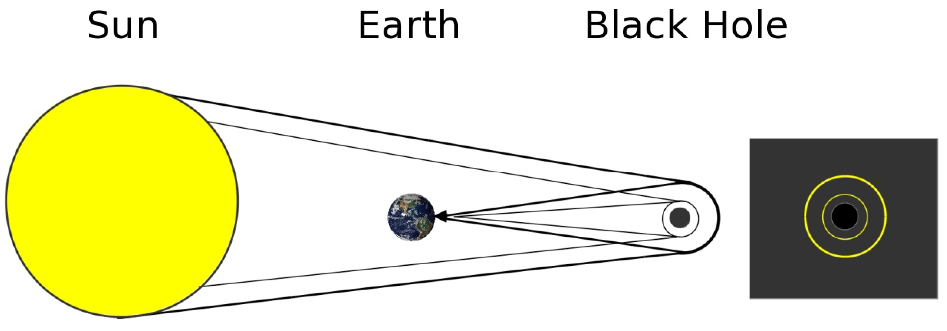 Retro-lensing of the Sun light by a black hole as seen from Earth. On the right-hand side, the series of rings around the black hole’s event horizon an observer would observe in the case of perfect alignment. For clarity, only two rings are shown.