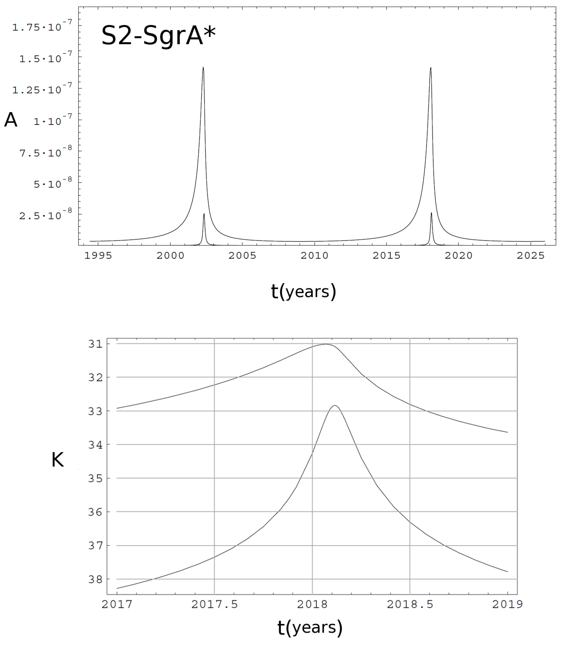 Upper panel: amplification as a function of time for the primary (upper curve) and secondary (lower curve) retro-lensing images of the S2 star by the black hole in the Galaxy center. Lower panel: light curve in K-band magnitude of the two retro-lensing images (adapted from [106]). The standard interstellar absorption coefficient towards the Galaxy center has been assumed.