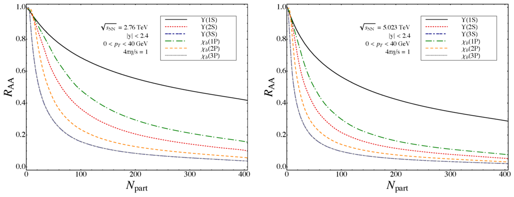 Heavy quark-bound states are of particular interest because they can survive into the deconfined phase due to their large binding energy. They are expected to survive up to a few times the pseudo-critical temperature, ; however, at sufficiently high temperatures, even heavy quark bound states should disassociate. As a result, in the late 1980’s Karsch, Matsui, Mehr, and Satz predicted that heavy quark–antiquark bound states, known as quarkonia, would be suppressed in heavy ion collisions compared to proton–proton (p-p) collisions [5,6]. The resulting suppression of heavy quarkonia can be used to probe the entire history of the QGP, since heavy quarkonium states are produced early in the QGP evolution. There has been a significant amount of work dedicated to the study of heavy quarkonia suppression. For recent related work, see References [7,8,9,10]. In this paper, we focus on bottomonia states which survive up to plasma temperatures of and 170 MeV for , , and states, respectively [11]. At these temperatures, the in-medium width of the state becomes on the order of the real part of its binding energy, and the state quickly dissociates; however, prior to this disassociation point, the states have large widths (∼50–100 MeV), with the widths for the excited states being larger than those for the ground state. As a consequence, one expects sequential melting of heavy bottomonia states in QGP, with excited states melting before the ground state, and lighter states dissociating before heavier states [12].