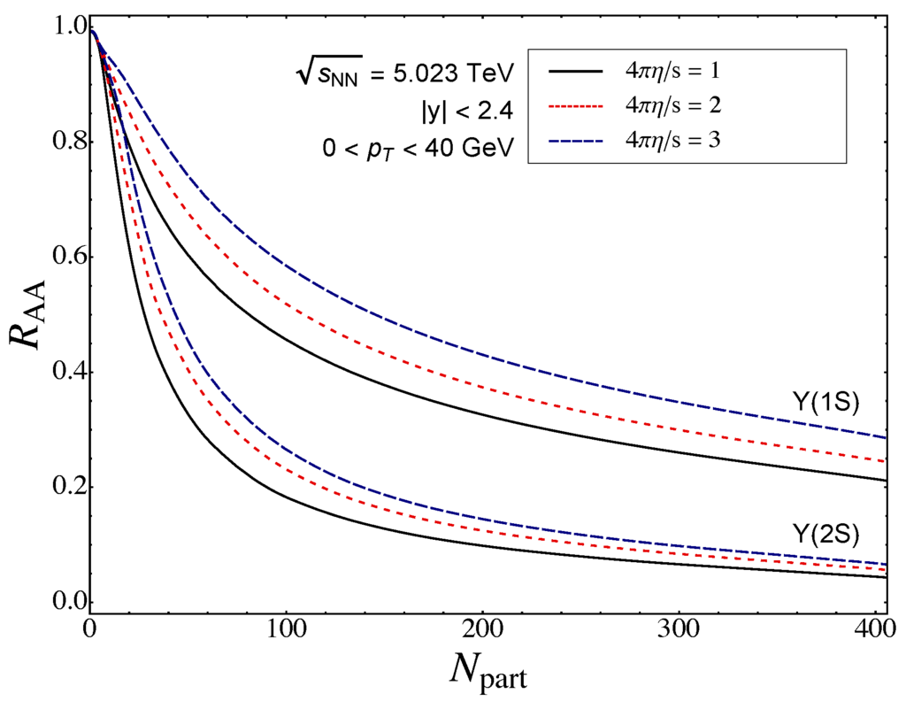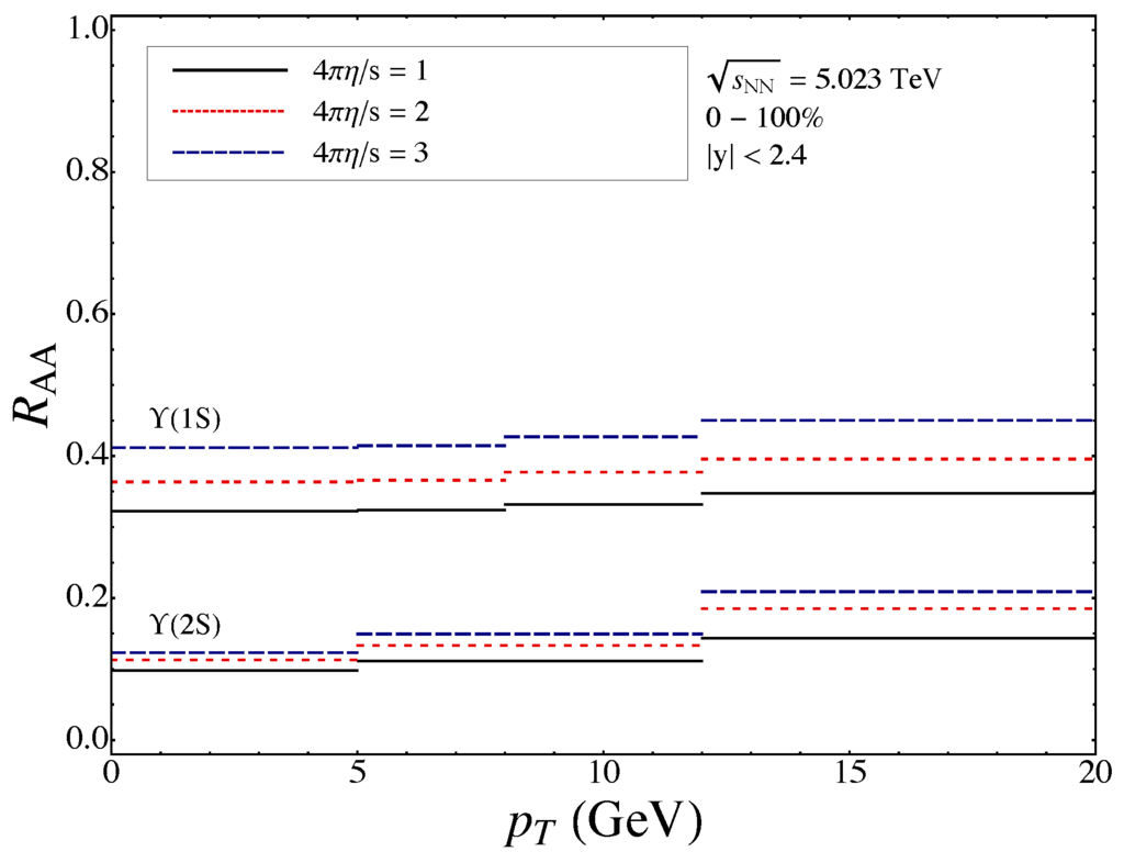 The primary goal of this work was to make predictions for bottomonia suppression at the latest LHC URHIC energy of . In order to make our predictions, we had to make some extrapolations of the initial conditions for the background. The key changes in going from 2.76 TeV to 5.023 TeV were a 16% increase in the initial central temperature, an increase in the width of the central rapidity plateau [38], and a small change in the nucleon–nucleon scattering cross section [35]. With these assumptions, we then made predictions with the same model employed in our prior works on this subject [24,25,26]. The model includes the effect of in-medium dissociation of bottomonia, uses a full 3 + 1d anisotropic viscous hydrodynamics background, and takes into account non-equilibrium modifications of the heavy quark potential associated with large momentum-space anisotropy. We did not include any cold nuclear matter effects or regeneration, since these are expected to be small for the bottomonia states.