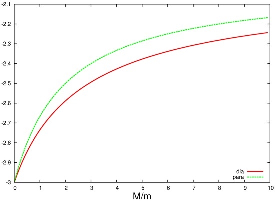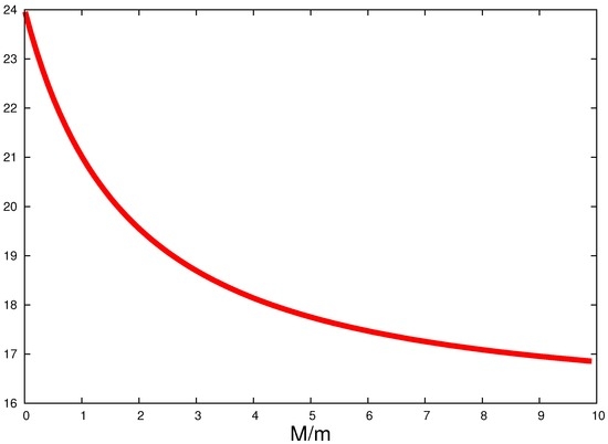 It turns out that the integrals , , , and can be calculated analytically. The details of this calculation are presented in Appendix A, where N is already set equal to 2. Performing the remaining u-integrations in Equations (A1) and (A2) numerically, one can see that is a positive, monotonically increasing function of the parameter , while is a negative and a monotonically decreasing function of γ. Both functions vanish at , i.e., in the limit of , as it should be. Remarkably, their ratio in this limit stays finite, being equal to . With the increase of γ, i.e., with the decrease of m, the absolute value of the ratio decreases, approaching at the expected value of 16 (cf. Ref. [65]). For illustration, we plot in Figure 1 the absolute value of the ratio in the range of .