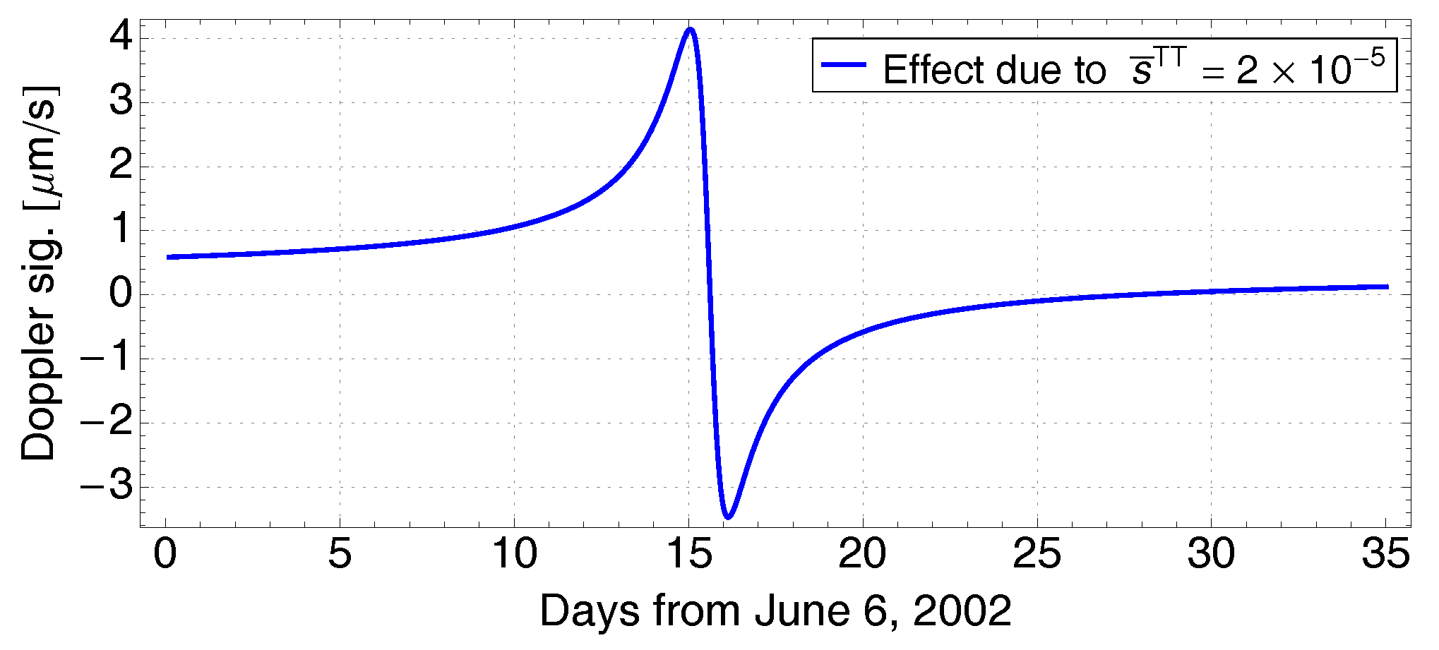 A violation of Lorentz symmetry within the gravity sector of SME induces different types of effects that can have implications on planetary ephemerides analysis: effects on the orbital dynamics and effects on the light propagation. Simulations using the Time Transfer Formalism [104,106,107] based on the software presented in [148] have shown that only the coefficients produce a non-negligible effect on the light propagation (while it has impact only at the next post-Newtonian level on the orbital dynamics [29,39]). On the other hand, the other coefficients produce non-negligible effects on the orbital dynamics [39] and can therefore be constrained using planetary ephemerides data. In the linearized gravity limit, the contribution from SME to the 2-body equations of motion within the gravitational sector of SME are given by the first line of Equation (17) (i.e., for a vanishing ). The coefficient is completely unobservable in this context since absorbed in a rescaling of the gravitational constant (see the discussion in [39,52]).