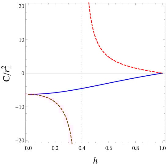 Plots of heat capacities (blue solid) and (red dashed) as functions of h. diverges at . is negative for and positive for . The heat capacities coincide at the limit values (Schwarzschild holes) and (extreme Kerr holes).