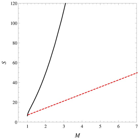 Plots of entropy S as a function of the mass–energy parameter M at fixed J, standard (black solid) and formal logarithm (red dashed) approaches. The standard entropy is asymptotically convex (being proportional to in the large M limit). The new entropy is a straight line because the entropy is proportional to the mass–energy.