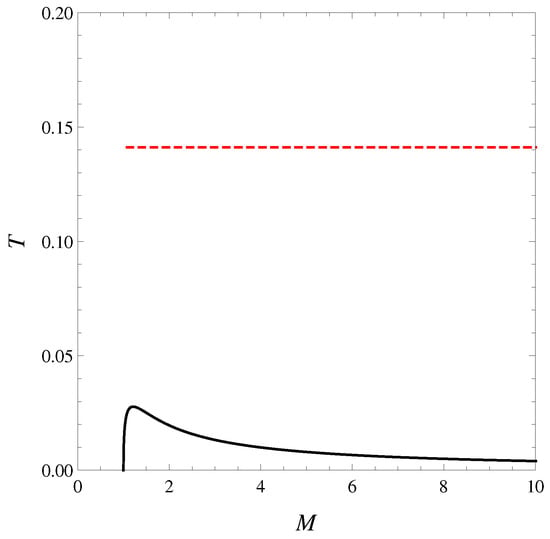 Plots of temperature T as a function of the mass–energy parameter M at fixed J— standard (black solid) and formal logarithm (red dashed) approaches. The standard temperature has a local maximum. The smaller mass branch corresponds with , and the larger mass with . The new temperature is a horizontal line because it is an energy-independent constant.