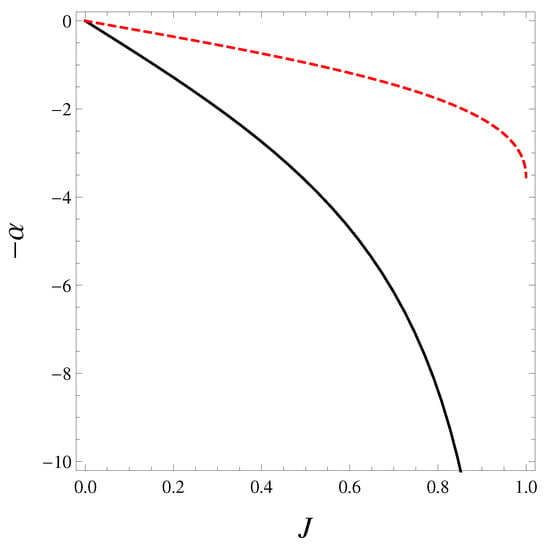 Plots of stability curves at fixed J of standard (black solid) and formal logarithm (red dashed) approaches in the microcanonical treatment. No vertical tangent occurs in either cases. By rotating the figure clockwise with , the stability curves of the canonical treatment can be obtained; i.e., at fixed J. There is a vertical tangent on the stability curve of standard case. The smaller mass branch () is more stable than the larger mass branch (). No turning point appears on the stability curve of the formal logarithm approach.