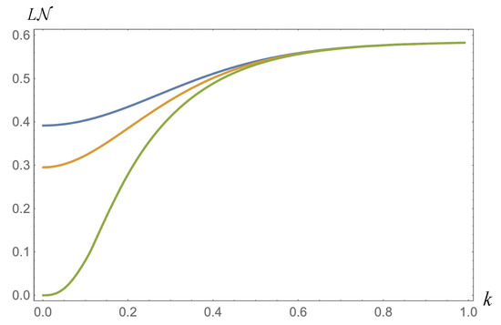 Plots of the logarighmic negativity as a function of k. The blue line is for , 1; the yellow is for , ; and the green is for , .