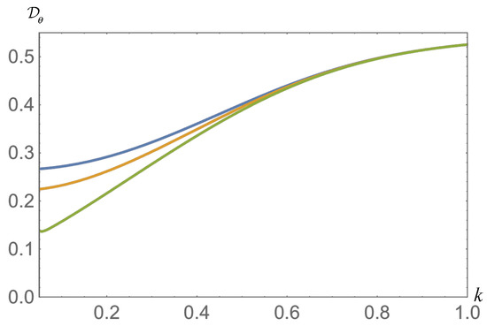 Plots of the quantum discord as a function of k. The blue line is for , 1; the yellow is for , ; and the green is for , .