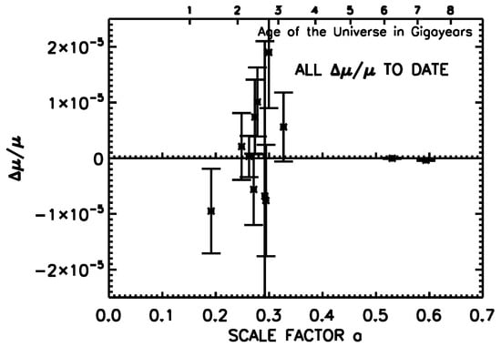 - King, J.A.; Webb, J.K.; Murphy, M.T.; Carswell, R.F. Stringent Null Constraint on Cosmological Evolution of the Proton-to-Electron Mass Ratio. Phys. Rev. Lett. 2008, 101, 251304. [Google Scholar] [CrossRef] [PubMed]