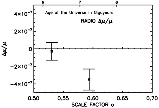 - Kanekar, N. Constraining Changes in the Proton–Electron Mass Ratio with Inversiona and Rotational Lines. Astrophys. J. Lett. 2011, 728, L12. [Google Scholar] [CrossRef]